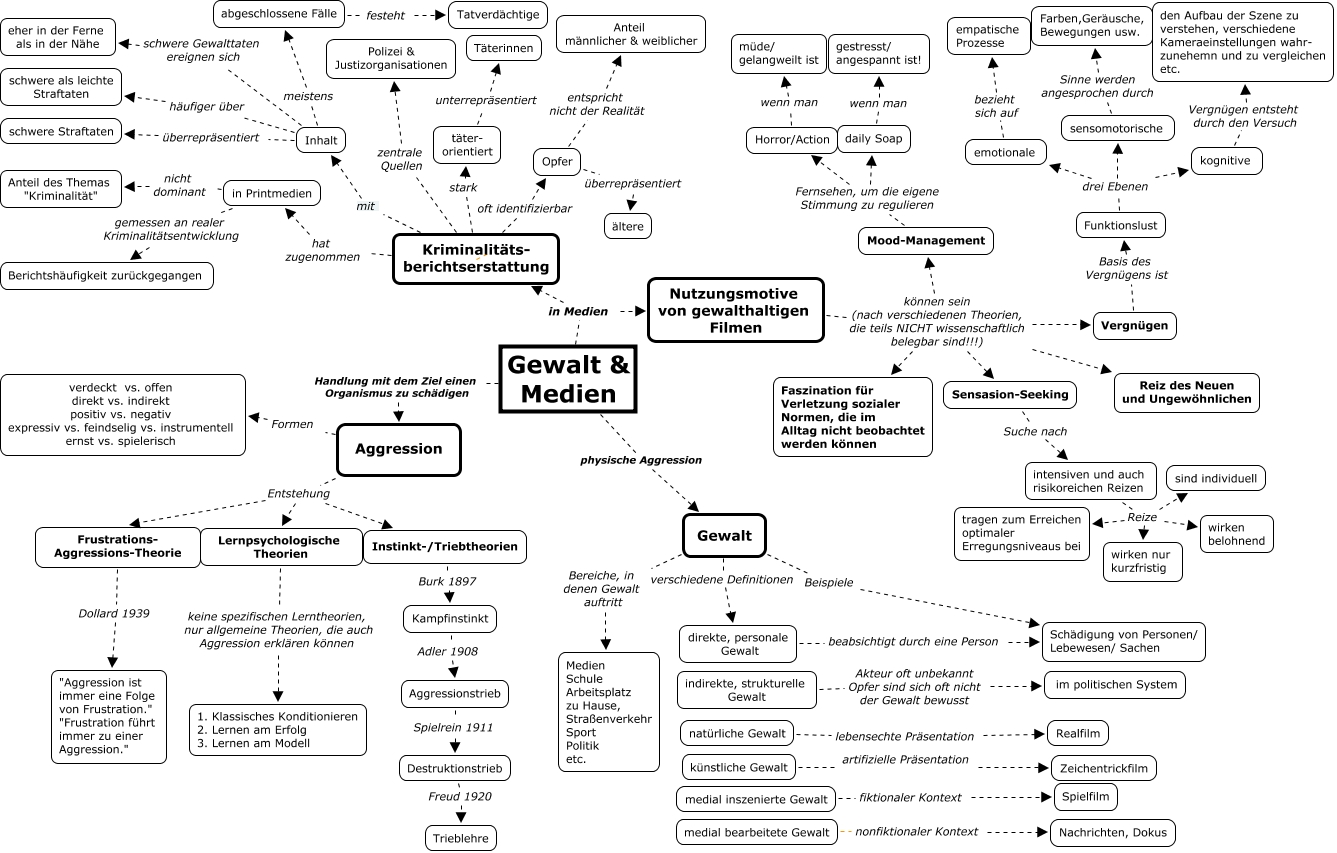 Dieses mit IHMC CmapTools erstellte CMap hat Informationen bezüglich: Aufgabe 1, Gewalt verschiedene Definitionen direkte, personale Gewalt, indirekte, strukturelle Gewalt Akteur oft unbekannt Opfer sind sich oft nicht der Gewalt bewusst im politischen System, Kriminalitäts- berichtserstattung stark täter- orientiert, abgeschlossene Fälle festeht Tatverdächtige, Inhalt meistens abgeschlossene Fälle, Inhalt überrepräsentiert schwere Straftaten, Destruktionstrieb Freud 1920 Trieblehre, Aggressionstrieb Spielrein 1911 Destruktionstrieb, direkte, personale Gewalt beabsichtigt durch eine Person Schädigung von Personen/ Lebewesen/ Sachen, Nutzungsmotive von gewalthaltigen Filmen können sein (nach verschiedenen Theorien, die teils NICHT wissenschaftlich belegbar sind!!!) Reiz des Neuen und Ungewöhnlichen, kognitive Vergnügen entsteht durch den Versuch den Aufbau der Szene zu verstehen, verschiedene Kameraeinstellungen wahr- zunehemn und zu vergleichen etc., Mood-Management Fernsehen, um die eigene Stimmung zu regulieren daily Soap, daily Soap wenn man gestresst/ angespannt ist!, Nutzungsmotive von gewalthaltigen Filmen können sein (nach verschiedenen Theorien, die teils NICHT wissenschaftlich belegbar sind!!!) Sensasion-Seeking, intensiven und auch risikoreichen Reizen Reize tragen zum Erreichen optimaler Erregungsniveaus bei, intensiven und auch risikoreichen Reizen Reize sind individuell, Inhalt häufiger über schwere als leichte Straftaten, Aggression Entstehung Instinkt-/Triebtheorien, Aggression Entstehung Frustrations- Aggressions-Theorie, Gewalt Beispiele Schädigung von Personen/ Lebewesen/ Sachen