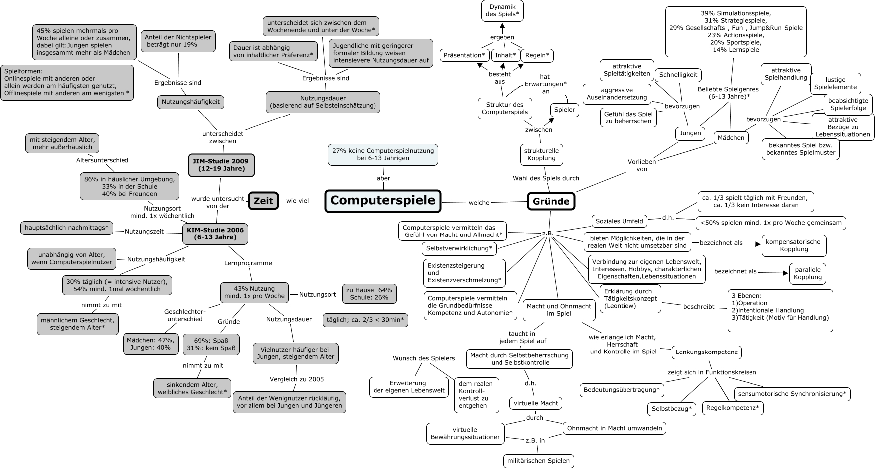 Dieses mit IHMC CmapTools erstellte CMap hat Informationen bezüglich: Aufgabe 3, Spieler hat Erwartungen* an Struktur des Computerspiels, Präsentation* ergeben Dynamik des Spiels*, Struktur des Computerspiels besteht aus Regeln*, Struktur des Computerspiels besteht aus Präsentation*, Struktur des Computerspiels besteht aus Inhalt*, Computerspiele aber 27% keine Computerspielnutzung bei 6-13 Jährigen, 43% Nutzung mind. 1x pro Woche Nutzungsdauer Vielnutzer häufiger bei Jungen, steigendem Alter, Jungen Beliebte Spielgenres (6-13 Jahre)* 39% Simulationsspiele, 31% Strategiespiele, 29% Gesellschafts-, Fun-, Jump&Run-Spiele 23% Actionsspiele, 20% Sportspiele, 14% Lernspiele, Soziales Umfeld d.h. ca. 1/3 spielt täglich mit Freunden, ca. 1/3 kein Interesse daran, Gründe z.B. Existenzsteigerung und Existenzverschmelzung*, Nutzungsdauer (basierend auf Selbsteinschätzung) Ergebnisse sind Jugendliche mit geringerer formaler Bildung weisen intensievere Nutzungsdauer auf, Nutzungsdauer (basierend auf Selbsteinschätzung) Ergebnisse sind Dauer ist abhängig von inhaltlicher Präferenz*, Regelkompetenz* zeigt sich in Funktionskreisen sensumotorische Synchronisierung*, Macht durch Selbstbeherrschung und Selbstkontrolle Wunsch des Spielers dem realen Kontroll- verlust zu entgehen, virtuelle Macht durch Ohnmacht in Macht umwandeln, JIM-Studie 2009 (12-19 Jahre) unterscheidet zwischen Nutzungsdauer (basierend auf Selbsteinschätzung), Computerspiele welche Gründe, Computerspiele wie viel Zeit, KIM-Studie 2006 (6-13 Jahre) Nutzungshäufigkeit 30% täglich (= intensive Nutzer), 54% mind. 1mal wöchentlich, 43% Nutzung mind. 1x pro Woche Geschlechter- unterschied Mädchen: 47%, Jungen: 40%