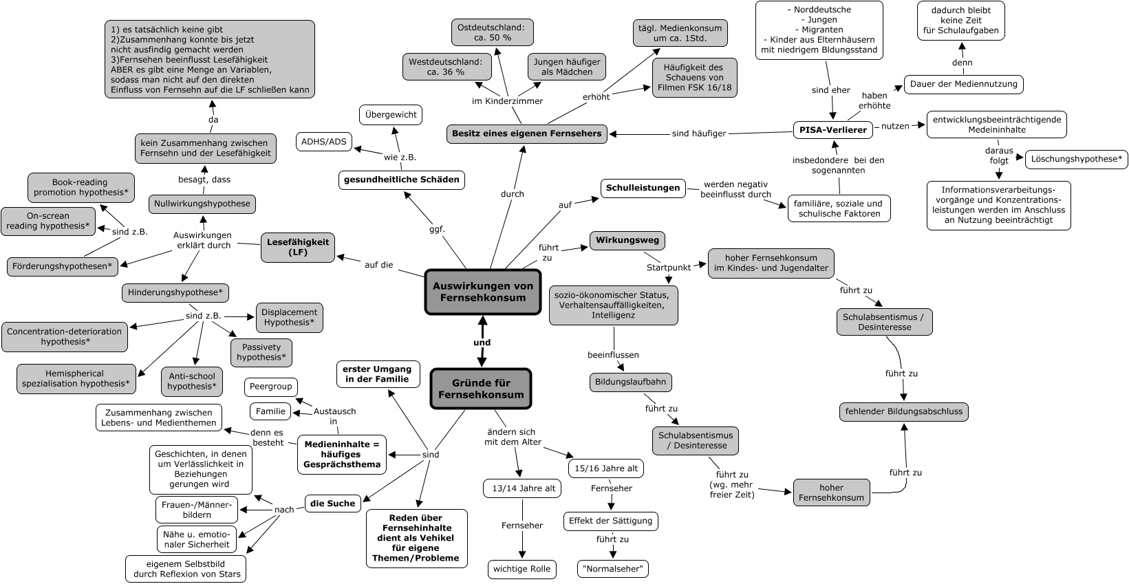 Dieses mit IHMC CmapTools erstellte CMap hat Informationen bezüglich: Aufgabe 2, hoher Fernsehkonsum im Kindes- und Jugendalter führt zu Schulabsentismus / Desinteresse, Auswirkungen von Fernsehkonsum führt zu Wirkungsweg, Auswirkungen von Fernsehkonsum ggf. gesundheitliche Schäden, Gründe für Fernsehkonsum sind die Suche, Hinderungshypothese* sind z.B. Passivety hypothesis*, Gründe für Fernsehkonsum sind erster Umgang in der Familie, Medieninhalte = häufiges Gesprächsthema Austausch in Familie, Gründe für Fernsehkonsum sind Medieninhalte = häufiges Gesprächsthema, PISA-Verlierer nutzen entwicklungsbeeinträchtigende Medeininhalte, PISA-Verlierer haben erhöhte Dauer der Mediennutzung, entwicklungsbeeinträchtigende Medeininhalte daraus folgt Informationsverarbeitungs- vorgänge und Konzentrations- leistungen werden im Anschluss an Nutzung beeinträchtigt, gesundheitliche Schäden wie z.B. Übergewicht, Förderungshypothesen* sind z.B. On-screan reading hypothesis*, Effekt der Sättigung führt zu "Normalseher", 13/14 Jahre alt Fernseher wichtige Rolle, PISA-Verlierer sind häufiger Besitz eines eigenen Fernsehers, die Suche nach Nähe u. emotio- naler Sicherheit, Schulabsentismus / Desinteresse führt zu fehlender Bildungsabschluss, sozio-ökonomischer Status, Verhaltensauffälligkeiten, Intelligenz beeinflussen Bildungslaufbahn, Besitz eines eigenen Fernsehers im Kinderzimmer Jungen häufiger als Mädchen