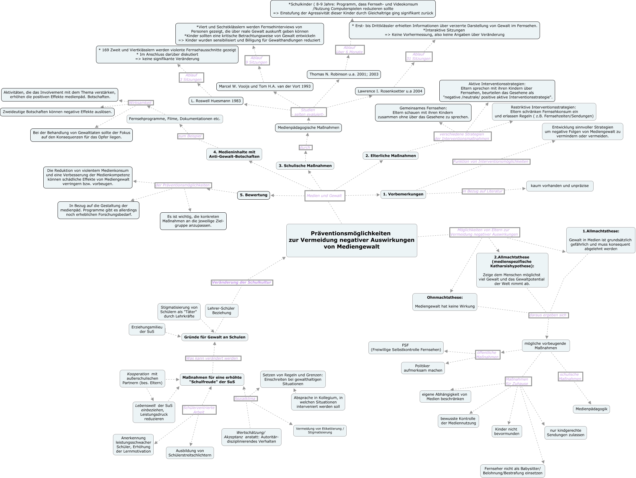 Dieses mit IHMC CmapTools erstellte CMap hat Informationen bezüglich: Aufgabe 1, Medienpädagogische Maßnahmen Studien - selten evaluiert- Lawrence I. Rosenkoetter u.a 2004, Medienpädagogische Maßnahmen Studien - selten evaluiert- Marcel W. Vooijs und Tom H.A. van der Vort 1993, Medienpädagogische Maßnahmen Studien - selten evaluiert- L. Roswell Huesmann 1983, Fernsehprogramme, Filme, Dokumentationen etc. Wirksamkeit Zweideutige Botschaften können negative Effekte auslösen., Fernsehprogramme, Filme, Dokumentationen etc. Wirksamkeit Aktivitäten, die das Involvement mit dem Thema verstärken, erhöhen die positiven Effekte medienpäd. Botschaften., Präventionsmöglichkeiten zur Vermeidung negativer Auswirkungen von Mediengewalt Möglichkeiten von Eltern zur Vermeidung negativer Auswirkungen Ohnmachtsthese: Mediengewalt hat keine Wirkung, Präventionsmöglichkeiten zur Vermeidung negativer Auswirkungen von Mediengewalt Möglichkeiten von Eltern zur Vermeidung negativer Auswirkungen 1.Allmachtsthese: Gewalt in Medien ist grundsätzlich gefährlich und muss konsequent abgelehnt werden, 2.Allmachtsthese (medienspezifische Katharsishypothese): Zeige dem Menschen möglichst viel Gewalt und das Gewaltpotential der Welt nimmt ab. daraus ergeben sich mögliche vorbeugende Maßnahmen, Wertschätzung/ Akzeptanz anstatt: Autoritär- disziplinierendes Verhalten Sozialklima Maßnahmen für eine erhöhte "Schulfreude" der SuS, mögliche vorbeugende Maßnahmen Maßnahmen für Zuhause bewusste Kontrolle der Mediennutzung, Kooperation mit außerschulischen Partnern (bes. Eltern) ???? Lebenswelt der SuS einbeziehen, Leistungsdruck reduzieren, 1. Vorbemerkungen in Bezug auf Literatur kaum vorhanden und unpräzise, Präventionsmöglichkeiten zur Vermeidung negativer Auswirkungen von Mediengewalt Medien und Gewalt 2. Elterliche Maßnahmen, mögliche vorbeugende Maßnahmen öffentliche Maßnahmen Politiker aufmerksam machen, 5. Bewertung der Präventionsmöglichkeiten Die Reduktion von violentem Medienkonsum und eine Verbesserung der Medienkompetenz können schädliche Effekte von Mediengewalt verringern bzw. vorbeugen., 5. Bewertung der Präventionsmöglichkeiten In Bezug auf die Gestaltung der medienpäd. Programme gibt es allerdings noch erheblichen Forschungsbedarf., Thomas N. Robinson u.a. 2001; 2003 Ablauf über 6 Monate *Schulkinder ( 8-9 Jahre: Programm, dass Fernseh- und Videokonsum /Nutzung Computerspielen reduzieren sollte => Einstufung der Agressivität dieser Kinder durch Gleichaltrige ging signifikant zurück, Marcel W. Vooijs und Tom H.A. van der Vort 1993 Ablauf 9 Sitzungen *Viert und Sechstklässlern werden Fernsehinterviews von Personen gezeigt, die über reale Gewalt auskunft geben können *Kinder sollten eine kritische Betrachtungsweise von Gewalt entwickeln => Kinder wurden sensibilisiert und Billigung für Gewalthandlungen reduziert, Medienpädagogische Maßnahmen Studien - selten evaluiert- Thomas N. Robinson u.a. 2001; 2003, 3. Schulische Maßnahmen durch Medienpädagogische Maßnahmen
