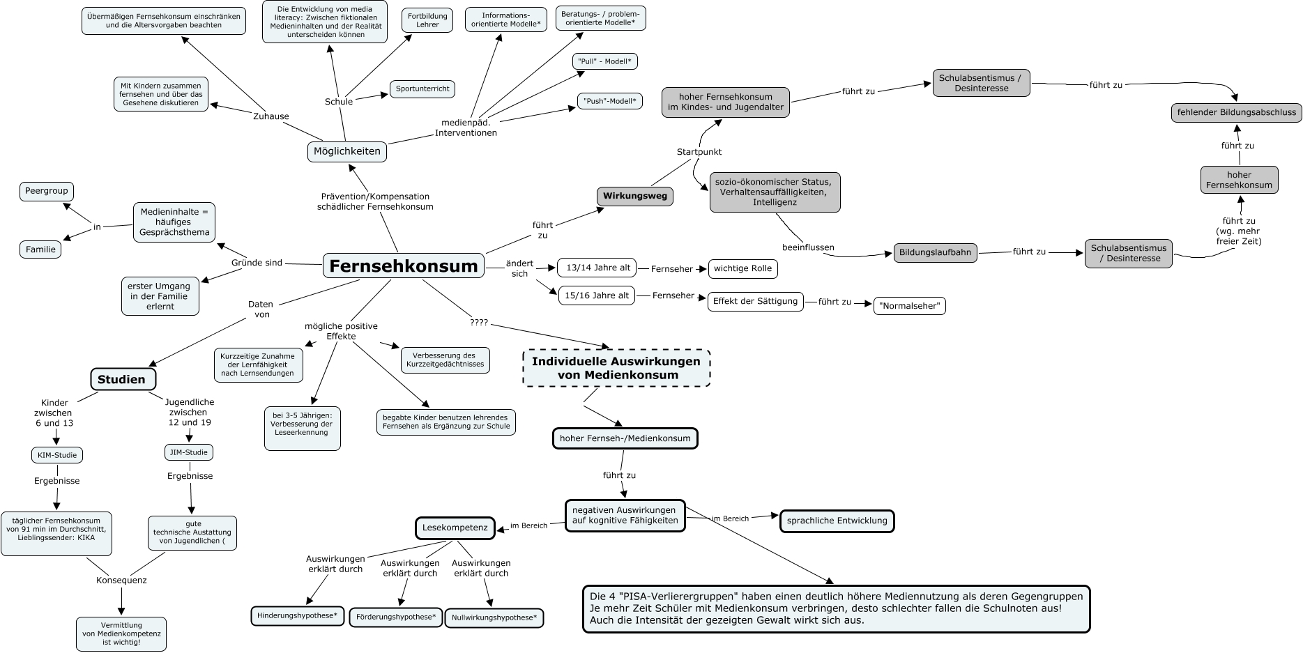 Dieses mit IHMC CmapTools erstellte CMap hat Informationen bezüglich: Aufgabe 2, 15/16 Jahre alt Fernseher Effekt der Sättigung, täglicher Fernsehkonsum von 91 min im Durchschnitt, Lieblingssender: KIKA Konsequenz Vermittlung von Medienkompetenz ist wichtig!, Fernsehkonsum ???? Individuelle Auswirkungen von Medienkonsum, hoher Fernseh-/Medienkonsum führt zu negativen Auswirkungen auf kognitive Fähigkeiten, Möglichkeiten Schule Sportunterricht, KIM-Studie Ergebnisse täglicher Fernsehkonsum von 91 min im Durchschnitt, Lieblingssender: KIKA, JIM-Studie Ergebnisse gute technische Austattung von Jugendlichen (, hoher Fernsehkonsum führt zu fehlender Bildungsabschluss, Schulabsentismus / Desinteresse führt zu (wg. mehr freier Zeit) hoher Fernsehkonsum, Fernsehkonsum Gründe sind Medieninhalte = häufiges Gesprächsthema, Fernsehkonsum Prävention/Kompensation schädlicher Fernsehkonsum Möglichkeiten, negativen Auswirkungen auf kognitive Fähigkeiten im Bereich sprachliche Entwicklung, Fernsehkonsum mögliche positive Effekte begabte Kinder benutzen lehrendes Fernsehen als Ergänzung zur Schule, Fernsehkonsum mögliche positive Effekte Verbesserung des Kurzzeitgedächtnisses, Fernsehkonsum ändert sich 13/14 Jahre alt, 13/14 Jahre alt Fernseher wichtige Rolle, Lesekompetenz Auswirkungen erklärt durch Hinderungshypothese*, Möglichkeiten medienpäd. Interventionen "Push"-Modell*, Möglichkeiten medienpäd. Interventionen "Pull" - Modell*, Möglichkeiten medienpäd. Interventionen Informations- orientierte Modelle*
