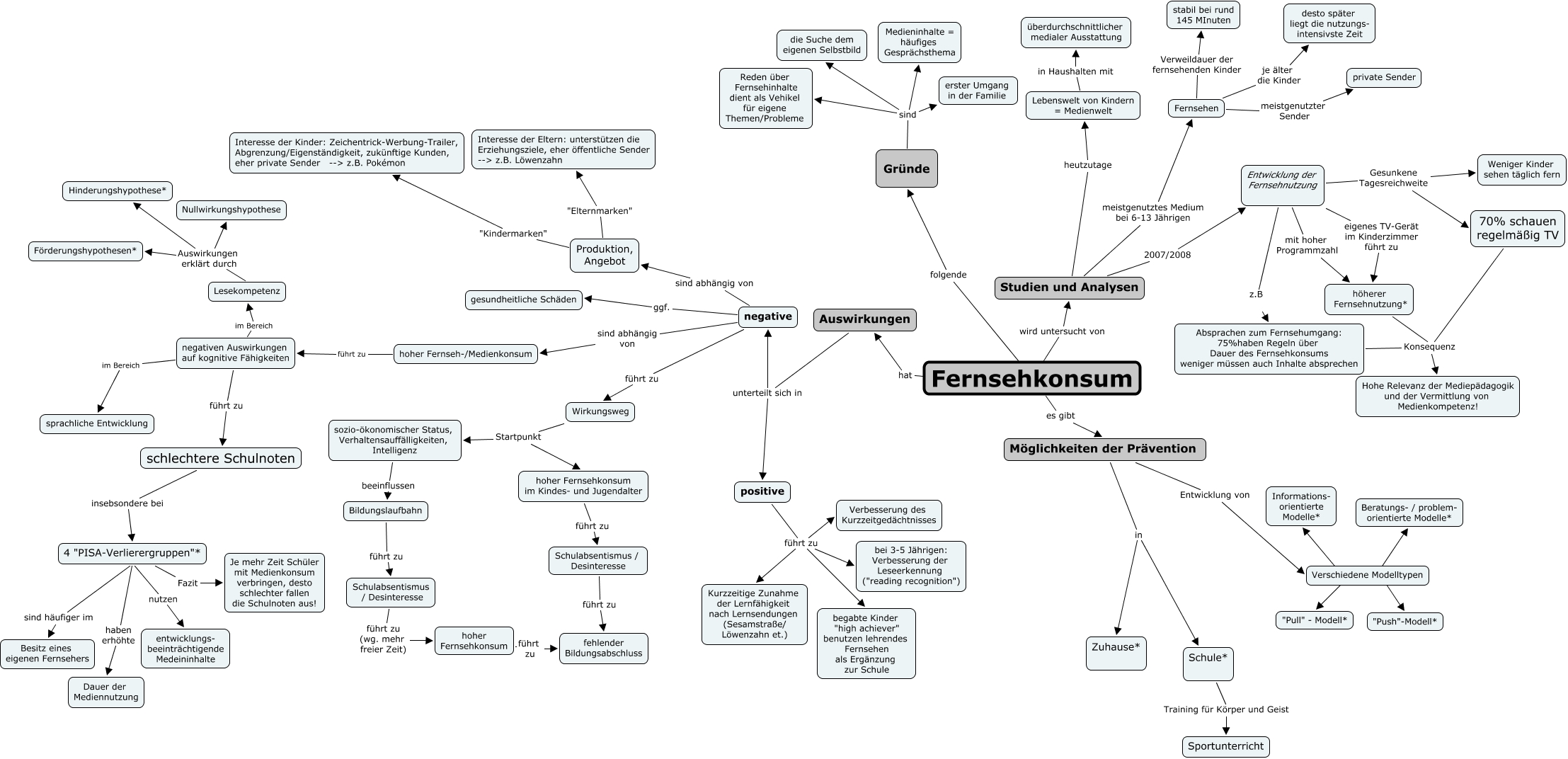 Dieses mit IHMC CmapTools erstellte CMap hat Informationen bezüglich: Aufgabe 2, Möglichkeiten der Prävention in Zuhause*, Auswirkungen unterteilt sich in positive, Schule* Training für Körper und Geist Sportunterricht, Fernsehkonsum es gibt Möglichkeiten der Prävention, Verschiedene Modelltypen ???? "Push"-Modell*, Verschiedene Modelltypen ???? "Pull" - Modell*, hoher Fernsehkonsum führt zu fehlender Bildungsabschluss, positive führt zu bei 3-5 Jährigen: Verbesserung der Leseerkennung ("reading recognition"), Auswirkungen unterteilt sich in negative, negative ggf. gesundheitliche Schäden, negative sind abhängig von Produktion, Angebot, Lesekompetenz Auswirkungen erklärt durch Förderungshypothesen*, Lesekompetenz Auswirkungen erklärt durch Nullwirkungshypothese, 4 "PISA-Verlierergruppen"* nutzen entwicklungs- beeinträchtigende Medeininhalte, 4 "PISA-Verlierergruppen"* haben erhöhte Dauer der Mediennutzung, hoher Fernseh-/Medienkonsum führt zu negativen Auswirkungen auf kognitive Fähigkeiten, Gründe sind erster Umgang in der Familie, Absprachen zum Fernsehumgang: 75%haben Regeln über Dauer des Fernsehkonsums weniger müssen auch Inhalte absprechen Konsequenz Hohe Relevanz der Mediepädagogik und der Vermittlung von Medienkompetenz!, Entwicklung der Fernsehnutzung z.B Absprachen zum Fernsehumgang: 75%haben Regeln über Dauer des Fernsehkonsums weniger müssen auch Inhalte absprechen, Entwicklung der Fernsehnutzung Gesunkene Tagesreichweite 70% schauen regelmäßig TV