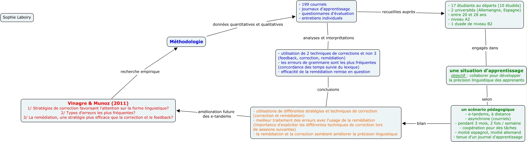 Cette carte de concepts créée avec IHMC CmapTools traite de: vinagre_sophie_laboiry, une situation d'apprentissage objectif : collaborer pour développer la précision linguistique des apprenants selon un scénario pédagogique - e-tandems, à distance - asynchrone (courriels) - pendant 3 mois, 2 fois / semaine - coopération pour des tâches - moitié espagnol, moitié allemand - tenue d'un journal d'apprentissage, - utilisations de différentes stratégies et techniques de correction (correction et remédiation) - meilleur traitement des erreurs avec l'usage de la remédiation (importance d'expliciter les différentes techniques de correction lors de sessions suivantes) - la remédiation et la correction semblent améliorer la précision linguistique amélioration future des e-tandems Vinagre & Munoz (2011) 1/ Stratégies de correction favorisant l'attention sur la forme linguistique? 2/ Types d'erreurs les plus fréquentes? 3/ La remédiation, une stratégie plus efficace que la correction et le feedback?, - 199 courriels - journaux d'apprentissage - questionnaires d'évaluation - entretiens individuels analyses et interprétations - utilisation de 2 techniques de corrections et non 3 (feedback, correction, remédiation) - les erreurs de grammaire sont les plus fréquentes (concordance des temps suivie du lexique) - efficacité de la remédiation remise en question, Vinagre & Munoz (2011) 1/ Stratégies de correction favorisant l'attention sur la forme linguistique? 2/ Types d'erreurs les plus fréquentes? 3/ La remédiation, une stratégie plus efficace que la correction et le feedback? recherche empirique Méthodologie, - utilisation de 2 techniques de corrections et non 3 (feedback, correction, remédiation) - les erreurs de grammaire sont les plus fréquentes (concordance des temps suivie du lexique) - efficacité de la remédiation remise en question conclusions - utilisations de différentes stratégies et techniques de correction (correction et remédiation) - meilleur traitement des erreurs avec l'usage de la remédiation (importance d'expliciter les différentes techniques de correction lors de sessions suivantes) - la remédiation et la correction semblent améliorer la précision linguistique, - 17 étudiants au départs (10 étudiés) - 2 universités (Allemangne, Espagne) - entre 20 et 28 ans - niveau A2 - 1 dyade de niveau B2 engagés dans une situation d'apprentissage objectif : collaborer pour développer la précision linguistique des apprenants, Méthodologie données quantitatives et qualitatives - 199 courriels - journaux d'apprentissage - questionnaires d'évaluation - entretiens individuels, un scénario pédagogique - e-tandems, à distance - asynchrone (courriels) - pendant 3 mois, 2 fois / semaine - coopération pour des tâches - moitié espagnol, moitié allemand - tenue d'un journal d'apprentissage bilan - utilisations de différentes stratégies et techniques de correction (correction et remédiation) - meilleur traitement des erreurs avec l'usage de la remédiation (importance d'expliciter les différentes techniques de correction lors de sessions suivantes) - la remédiation et la correction semblent améliorer la précision linguistique, - 199 courriels - journaux d'apprentissage - questionnaires d'évaluation - entretiens individuels recueillies auprès - 17 étudiants au départs (10 étudiés) - 2 universités (Allemangne, Espagne) - entre 20 et 28 ans - niveau A2 - 1 dyade de niveau B2