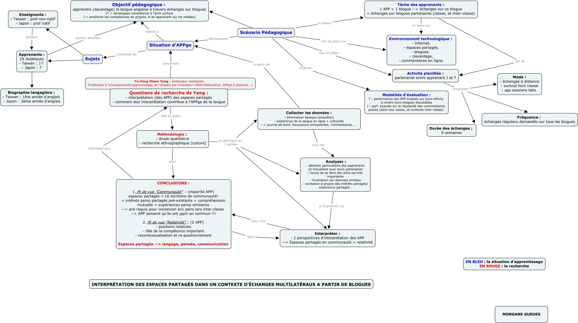 Cette carte de concepts créée avec IHMC CmapTools traite de: txt_YANG_Morgane_Guedes, CONCLUSIONS : 1. Pt de vue "Communauté" : (majorité APP) espaces partagés = LE territoire de communauté! + intêrets perso partagés pré-existants + compréhension mutuelle + expériences perso similaires --> pré-requis pour connexion avc pairs lors inter-classe --> APP pensent qu'ils ont qqch en commun !!! 2. Pt de vue "Relativité" : (2 APP) - positions relatives - rôle de la compétence important - recontextualisation et re-positionnement Espaces partagés --> langage, pensée, communication liées Interpréter : - 2 perspectives d'interprétation des APP --> Espaces partagés en communauté > relativité, Questions de recherche de Yang : - interprétation (des APP) des espaces partagés - comment leur interprétation contribue à l'APPge de la langue concernant Situation d'APPge, Apprenants : 24 Asiatiques - Taiwan : 17 - Japon : 7 ???? Biographie langagière : - Taiwan : 1ère année d'anglais - Japon : 2ème année d'anglais, Enseignants : - Taiwan : prof non-natif - Japon : prof natif guident Apprenants : 24 Asiatiques - Taiwan : 17 - Japon : 7, Scénario Pédagogique à travers Tâche des apprenants : 1 APP = 1 blogue --> échanges sur ce blogue + échanges sur blogues partenaires (classe, et inter-classe), Méthodologie : - étude qualitative - recherche ethnographique (culture) se déroulant en 3 parties Interpréter : - 2 perspectives d'interprétation des APP --> Espaces partagés en communauté > relativité, Situation d'APPge répond à Objectif pédagogique : apprendre (davantage) la langue anglaise à travers échanges sur blogues (T = développer compétence à l'écrit surtout J = améliorer les compétences en anglais, tt en apprenant sur les médias), Activité planifiée : partenariat entre apprenant J et T respectant Mode : - échanges à distance - surtout hors classe - qqs sessions labo, Scénario Pédagogique met en place Activité planifiée : partenariat entre apprenant J et T, Scénario Pédagogique propose Modalités d'évaluation : T : performance des APP évaluée sur leurs efforts à rendre leurs blogues discutables J : perf. évaluée sur la régularité des commentaires postés (dans leur classe, et contexte inter-classe), CONCLUSIONS : 1. Pt de vue "Communauté" : (majorité APP) espaces partagés = LE territoire de communauté! + intêrets perso partagés pré-existants + compréhension mutuelle + expériences perso similaires --> pré-requis pour connexion avc pairs lors inter-classe --> APP pensent qu'ils ont qqch en commun !!! 2. Pt de vue "Relativité" : (2 APP) - positions relatives - rôle de la compétence important - recontextualisation et re-positionnement Espaces partagés --> langage, pensée, communication répondent aux Questions de recherche de Yang : - interprétation (des APP) des espaces partagés - comment leur interprétation contribue à l'APPge de la langue, Situation d'APPge composée de Sujets, Sujets ???? Apprenants : 24 Asiatiques - Taiwan : 17 - Japon : 7, Sujets ???? Enseignants : - Taiwan : prof non-natif - Japon : prof natif, Collecter les données : - information basique (enquêtes) - expérience de la langue en ligne + culturelle --> journal de bord, discussions enregistrées, commentaires,... à partir de Situation d'APPge, Analyser : - attentes particulières des apprenants en travaillant avec leurs partenaires - l'envie de se faire des amis est très importante - frustration car réponses limitées - excitation à propos des intérêts partagés/ expérience partagée. et finalement les Interpréter : - 2 perspectives d'interprétation des APP --> Espaces partagés en communauté > relativité, Scénario Pédagogique mis en place sur Environnement technologique : - Internet, - espaces partagés, - blogues, - clavardage, - commentaires en ligne., Tâche des apprenants : 1 APP = 1 blogue --> échanges sur ce blogue + échanges sur blogues partenaires (classe, et inter-classe) lors de Activité planifiée : partenariat entre apprenant J et T, Activité planifiée : partenariat entre apprenant J et T respectant Fréquence : échanges réguliers demandés sur tous les blogues, Scénario Pédagogique déroulement Situation d'APPge