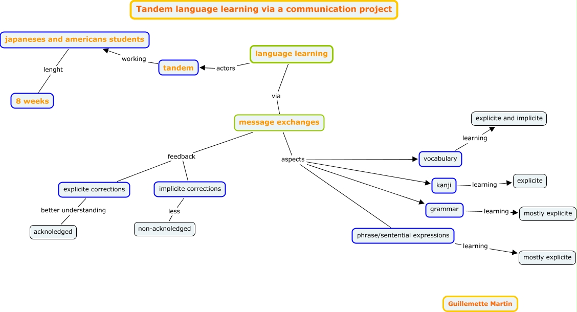 Cette carte de concepts créée avec IHMC CmapTools traite de: kabata Guillemette Martin, message exchanges aspects grammar, message exchanges aspects kanji, message exchanges feedback explicite corrections, message exchanges feedback implicite corrections, kanji learning explicite, language learning via message exchanges, japaneses and americans students lenght 8 weeks, vocabulary learning explicite and implicite, explicite corrections better understanding acknoledged, implicite corrections less non-acknoledged, phrase/sentential expressions learning mostly explicite, language learning actors tandem, message exchanges aspects vocabulary, message exchanges aspects phrase/sentential expressions, tandem working japaneses and americans students, grammar learning mostly explicite