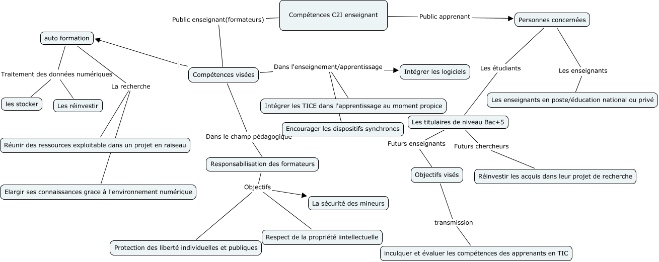 Cette carte de concepts créée avec IHMC CmapTools traite de: Carte conceptuelle C2I Nabil ZAIDI, Les titulaires de niveau Bac+5 Futurs enseignants Objectifs visés, Compétences C2I enseignant Public apprenant Personnes concernées, Responsabilisation des formateurs Objectifs La sécurité des mineurs, auto formation Traitement des données numériques les stocker, Compétences visées auto formation, Objectifs visés transmission inculquer et évaluer les compétences des apprenants en TIC, auto formation La recherche Elargir ses connaissances grace à l'environnement numérique, Responsabilisation des formateurs Objectifs Protection des liberté individuelles et publiques, Responsabilisation des formateurs Objectifs Respect de la propriété iintellectuelle, Compétences visées Dans le champ pédagogique Responsabilisation des formateurs, Personnes concernées Les étudiants Les titulaires de niveau Bac+5, auto formation La recherche Réunir des ressources exploitable dans un projet en raiseau, Compétences C2I enseignant Public enseignant(formateurs) Compétences visées, Compétences visées Dans l'enseignement/apprentissage Intégrer les TICE dans l'apprentissage au moment propice, Compétences visées Dans l'enseignement/apprentissage Encourager les dispositifs synchrones, Compétences visées Dans l'enseignement/apprentissage Intégrer les logiciels, Les titulaires de niveau Bac+5 Futurs chercheurs Réinvestir les acquis dans leur projet de recherche, Personnes concernées Les enseignants Les enseignants en poste/éducation national ou privé, auto formation Traitement des données numériques Les réinvestir