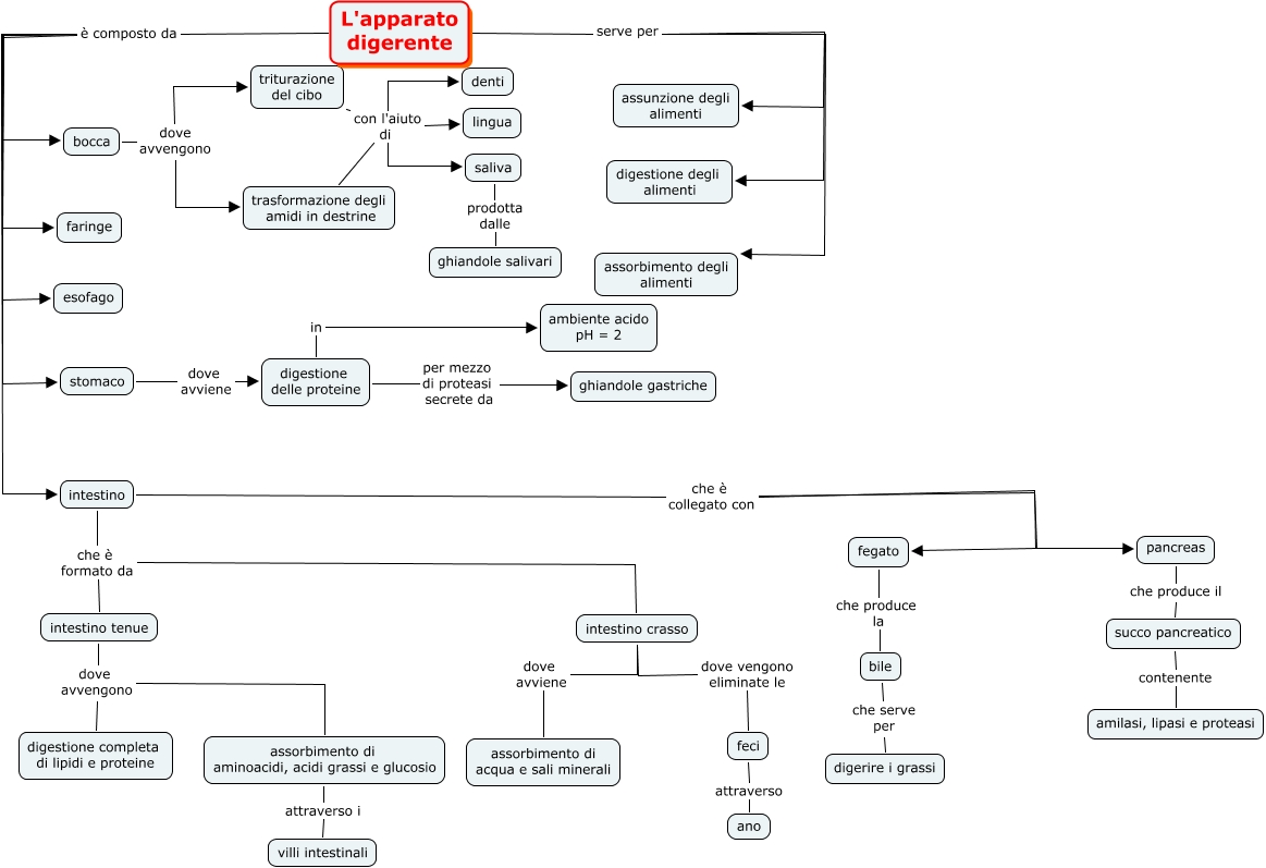 Questa Cmap, creata con IHMC CmapTools, contiene informazioni relative a: Apparato digerente, trasformazione degli amidi in destrine con l'aiuto di denti, intestino tenue dove avvengono digestione completa di lipidi e proteine, intestino crasso dove avviene assorbimento di acqua e sali minerali, intestino crasso dove vengono eliminate le feci, L'apparato digerente serve per digestione degli alimenti, bocca dove avvengono trasformazione degli amidi in destrine, triturazione del cibo con l'aiuto di denti, triturazione del cibo con l'aiuto di saliva, L'apparato digerente è composto da bocca, triturazione del cibo con l'aiuto di lingua, feci attraverso ano, fegato che produce la bile, L'apparato digerente è composto da faringe, intestino tenue dove avvengono assorbimento di aminoacidi, acidi grassi e glucosio, pancreas che produce il succo pancreatico, saliva prodotta dalle ghiandole salivari, intestino che è collegato con fegato, intestino che è formato da intestino tenue, L'apparato digerente è composto da stomaco, L'apparato digerente è composto da intestino
