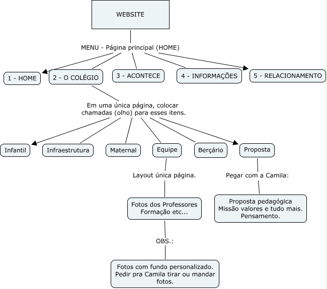 Esse mapa conceitual, produzido no IHMC CmapTools, tem a informação relacionada a: WEBSITE, 2 - O COLÉGIO Em uma única página, colocar chamadas (olho) para esses itens. Equipe, WEBSITE MENU - Página principal (HOME) 5 - RELACIONAMENTO, 2 - O COLÉGIO Em uma única página, colocar chamadas (olho) para esses itens. Maternal, 2 - O COLÉGIO Em uma única página, colocar chamadas (olho) para esses itens. Berçário, 2 - O COLÉGIO Em uma única página, colocar chamadas (olho) para esses itens. Proposta, WEBSITE MENU - Página principal (HOME) 3 - ACONTECE, WEBSITE MENU - Página principal (HOME) 4 - INFORMAÇÕES, Fotos dos Professores Formação etc... OBS.: Fotos com fundo personalizado. Pedir pra Camila tirar ou mandar fotos., Proposta Pegar com a Camila: Proposta pedagógica Missão valores e tudo mais. Pensamento., 2 - O COLÉGIO Em uma única página, colocar chamadas (olho) para esses itens. Infraestrutura, WEBSITE MENU - Página principal (HOME) 1 - HOME, Equipe Layout única página. Fotos dos Professores Formação etc..., 2 - O COLÉGIO Em uma única página, colocar chamadas (olho) para esses itens. Infantil, WEBSITE MENU - Página principal (HOME) 2 - O COLÉGIO
