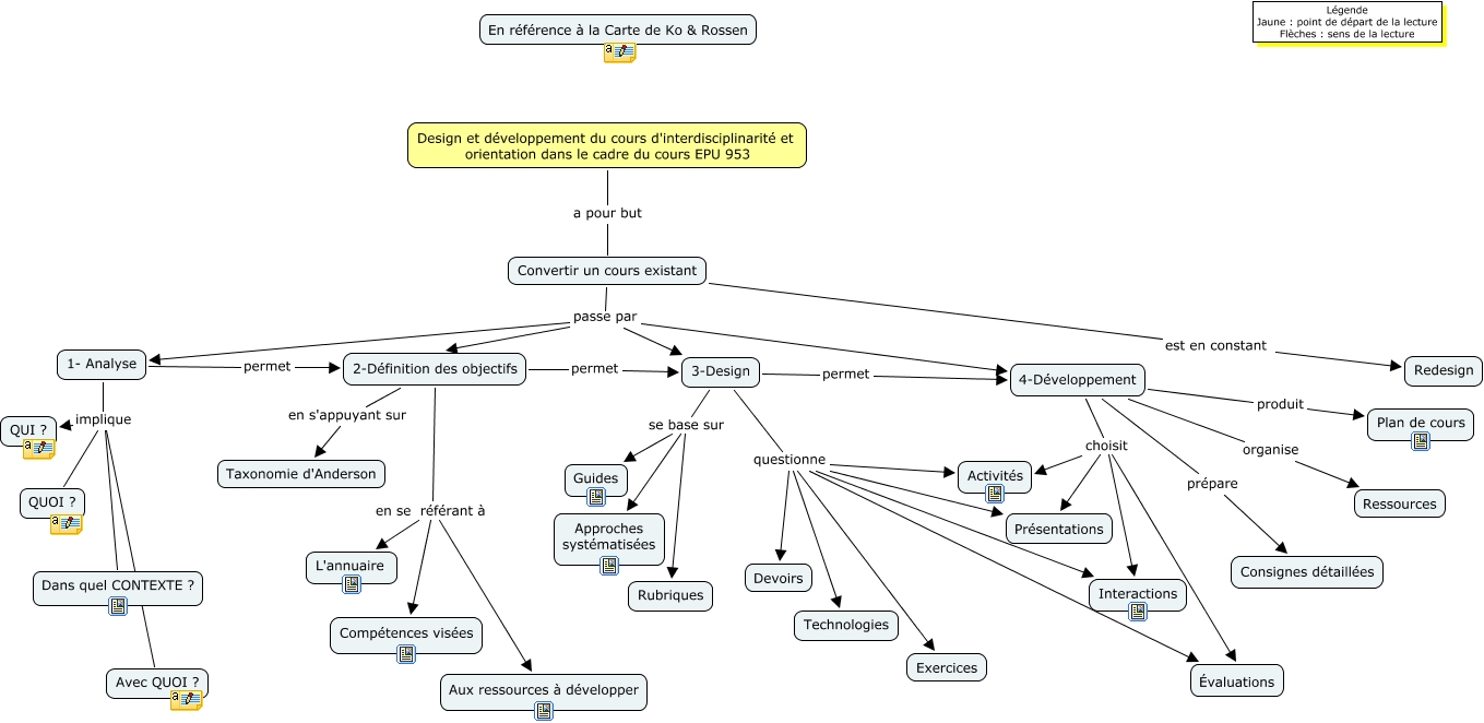 Cette carte de concepts créée avec IHMC CmapTools traite de: Design et développement du cours d'interdisciplinarité et orientation, Convertir un cours existant passe par 3-Design, 1- Analyse implique Dans quel CONTEXTE ?, Design et développement du cours d'interdisciplinarité et orientation dans le cadre du cours EPU 953 a pour but Convertir un cours existant, 2-Définition des objectifs en se référant à L'annuaire, 4-Développement organise Ressources, 4-Développement choisit Activités, 4-Développement produit Plan de cours, Convertir un cours existant est en constant Redesign, 3-Design se base sur Rubriques, 3-Design questionne Technologies, 1- Analyse permet 2-Définition des objectifs, 1- Analyse implique Avec QUOI ?, 3-Design se base sur Approches systématisées, Convertir un cours existant passe par 1- Analyse, Convertir un cours existant passe par 4-Développement, Convertir un cours existant passe par 2-Définition des objectifs, 4-Développement choisit Présentations, 4-Développement prépare Consignes détaillées, 3-Design questionne Devoirs, 3-Design permet 4-Développement