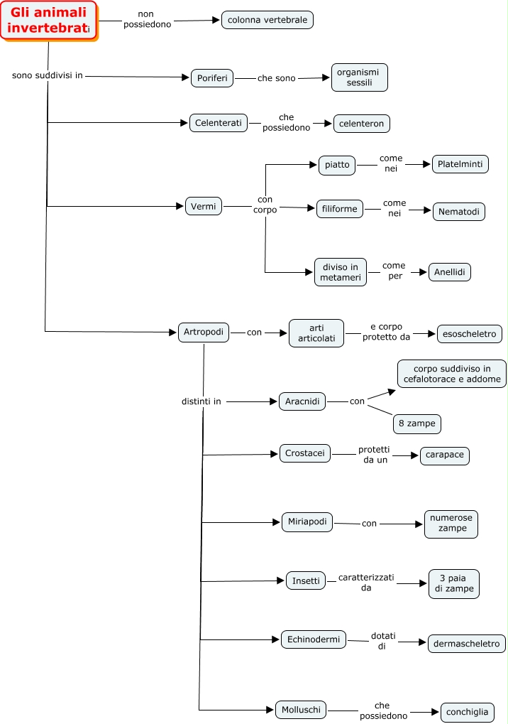 Questa Cmap, creata con IHMC CmapTools, contiene informazioni relative a: Animali Invertebrati, Gli animali invertebrati sono suddivisi in Vermi, Echinodermi dotati di dermascheletro, Vermi con corpo diviso in metameri, Artropodi distinti in Molluschi, Gli animali invertebrati non possiedono colonna vertebrale, Gli animali invertebrati sono suddivisi in Poriferi, filiforme come nei Nematodi, Insetti caratterizzati da 3 paia di zampe, Molluschi che possiedono conchiglia, Poriferi che sono organismi sessili, Crostacei protetti da un carapace, Artropodi distinti in Miriapodi, Artropodi distinti in Crostacei, piatto come nei Platelminti, Gli animali invertebrati sono suddivisi in Artropodi, Miriapodi con numerose zampe, Gli animali invertebrati sono suddivisi in Celenterati, Celenterati che possiedono celenteron, Artropodi distinti in Echinodermi, Artropodi distinti in Insetti