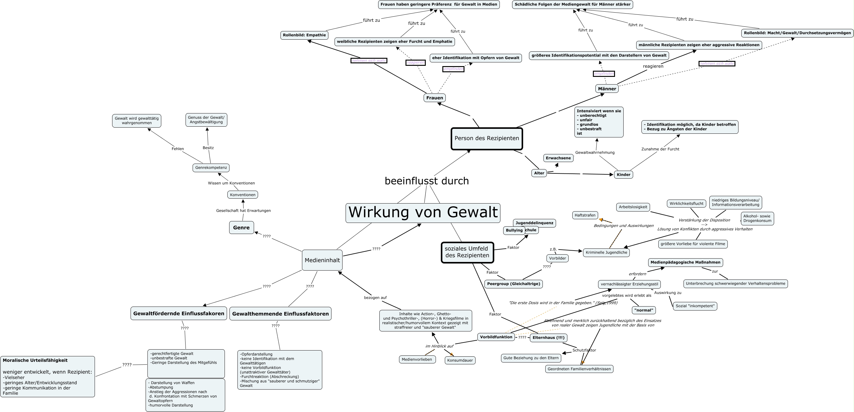 Dieses mit IHMC CmapTools erstellte CMap hat Informationen bezüglich: Aufgabe 1 neu, Vorbildfunktion im Hinblick auf Konsumdauer, Alter Erwachsene, Vorbildfunktion im Hinblick auf Konsumdauer, Vorbildfunktion im Hinblick auf Medienvorlieben, Kinder Gewaltwahrnehmung Intensiviert wenn sie - unberechtigt - unfair - grundlos - unbestraft ist, männliche Rezipienten zeigen eher aggressive Reaktionen führt zu Schädliche Folgen der Mediengewalt für Männer stärker, Vorbildfunktion im Hinblick auf Inhalte wie Action-, Ghetto- und Psychothriller-, (Horror-) & Kriegsfilme in realistischer/humorvollem Kontext gezeigt mit straffreier und "sauberer Gewalt", Männer empfinden größeres Identifikationspotential mit den Darstellern von Gewalt, Medienvorlieben im Hinblick auf Inhalte wie Action-, Ghetto- und Psychothriller-, (Horror-) & Kriegsfilme in realistischer/humorvollem Kontext gezeigt mit straffreier und "sauberer Gewalt", Medienpädagogische Maßnahmen zur Unterbrechung schwerwiegender Verhaltensprobleme, Vorbilder z.B. Kriminelle Jugendliche, Medieninhalt ???? Gewaltfördernde Einflussfakoren, Erwachsene Gewaltwahrnehmung Intensiviert wenn sie - unberechtigt - unfair - grundlos - unbestraft ist, vernachlässigter Erziehungsstil erfordern Medienpädagogische Maßnahmen, Vorbildfunktion vorgelebtes wird erlebt als "normal", Genrekompetenz Besitz Genuss der Gewalt/ Angstbewältigung, Männer nehmen sich wahr Rollenbild: Macht/Gewalt/Durchsetzungsvermögen, Medieninhalt ???? Genre, Gewalthemmende Einflussfaktoren ???? -Opferdarstellung -keine Identifikation mit dem Gewalttätigen -keine Vorbildfunktion (unattraktiver Gewalttäter) -Furchtreaktion (Abschreckung) -Mischung aus "sauberer und schmutziger" Gewalt, Wirklichkeitsflucht Verstärkung der Disposition --> Lösung von Konflikten durch aggressives Verhalten Kriminelle Jugendliche