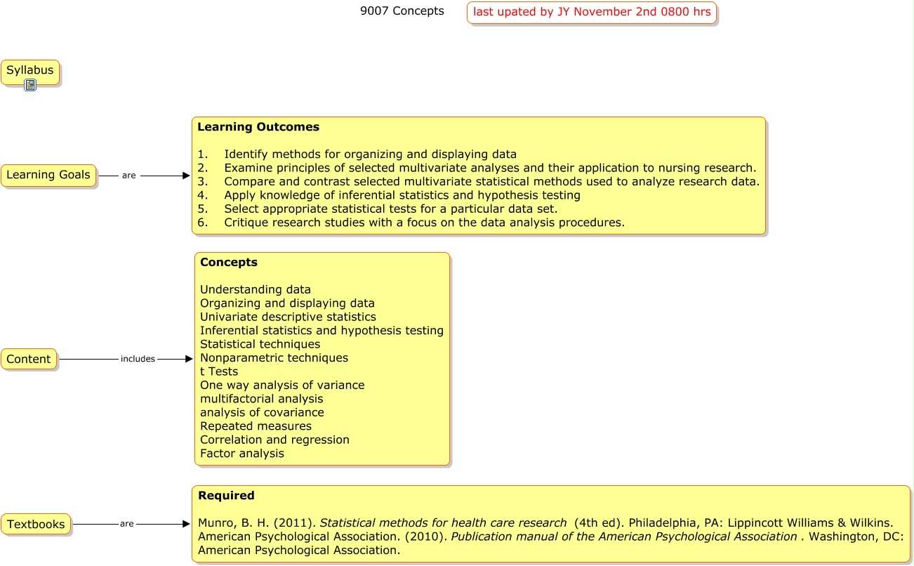 This Concept Map, created with IHMC CmapTools, has information related to: 9007, Textbooks are Required Munro, B. H. (2011). Statistical methods for health care research (4th ed). Philadelphia, PA: Lippincott Williams & Wilkins. American Psychological Association. (2010). Publication manual of the American Psychological Association. Washington, DC: American Psychological Association., Content includes Concepts Understanding data Organizing and displaying data Univariate descriptive statistics Inferential statistics and hypothesis testing Statistical techniques Nonparametric techniques t Tests One way analysis of variance multifactorial analysis analysis of covariance Repeated measures Correlation and regression Factor analysis, Learning Goals are Learning Outcomes 1. Identify methods for organizing and displaying data 2. Examine principles of selected multivariate analyses and their application to nursing research. 3. Compare and contrast selected multivariate statistical methods used to analyze research data. 4. Apply knowledge of inferential statistics and hypothesis testing 5. Select appropriate statistical tests for a particular data set. 6. Critique research studies with a focus on the data analysis procedures.