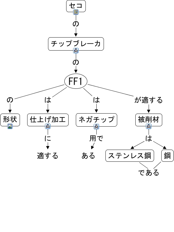 このコンセプトマップに関連する情報: FF1, 被削材 は ステンレス鋼, FF1 は 仕上げ加工, FF1 の <math xmlns="http://www.w3.org/1998/Math/MathML"> <mtext> 形状 </mtext> </math>, 仕上げ加工 に 適する, ステンレス鋼 である, 鋼 である, セコ の チップブレーカ, ネガチップ 用で ある, FF1 が適する 被削材, チップブレーカ の FF1, FF1 は ネガチップ, 被削材 は 鋼