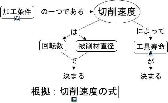 このコンセプトマップに関連する情報: 切削速度, 回転数 で 決まる, 加工条件 の一つである 切削速度, 切削速度 は 被削材直径, 工具寿命 が 決まる, 切削速度 によって 工具寿命, 被削材直径 で 決まる, 切削速度 は 回転数