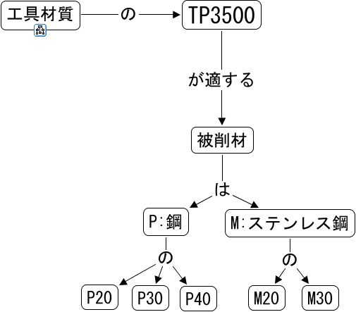 このコンセプトマップに関連する情報: TP3500, P:鋼 の P20, 被削材 は M:ステンレス鋼, P:鋼 の P40, TP3500 が適する 被削材, M:ステンレス鋼 の M30, M:ステンレス鋼 の M20, P:鋼 の P30, 工具材質 の TP3500, 被削材 は P:鋼