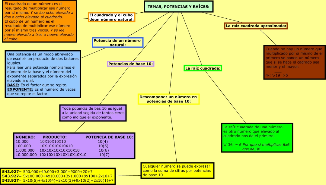 Este Cmap, tiene información relacionada con: tema 5 potencias y raíces, Toda potencia de bas 10 es igual a la unidad segida de tantos ceros como indique el exponente. ???? NÚMERO: PRODUCTO: POTENCIA DE BASE 10: 10.000 10X10X10X10 10(4) 100.000 10X10X10X10X10 10(5) 1.000.000 10X10X10X10X10X10 10(6) 10.000.000 10X10X10X10X10X10X10 10(7), TEMA5, POTENCIAS Y RAÍCES: Descomponer un número en potencias de base 10: Cualquier número se puede expresar como la suma de cifras por potencias de base 10., TEMA5, POTENCIAS Y RAÍCES: Potencias de base 10: Toda potencia de bas 10 es igual a la unidad segida de tantos ceros como indique el exponente., TEMA5, POTENCIAS Y RAÍCES: El cuadrado y el cubo deun número natural: El cuadrado de un número es el resultado de multiplicar ese número por sí mismo. Y se lee ocho elevado a dos o ocho elevado al cuadrado. El cubo de un número es el resultado de multiplicar ese número por sí mismo tres veces. Y se lee nueve elevado a tres o nueve elevado al cubo., TEMA5, POTENCIAS Y RAÍCES: Potencia de un número natural: Una potencia es un modo abreviado de escribir un producto de dos factores iguales. Para leer una potencia nombramos el número de la base y el número del exponente separados por la expresión elavado a o al. BASE: Es el factor que se repite. EXPONENTE: Es el número de veces que se repite el factor., TEMA5, POTENCIAS Y RAÍCES: La raíz cuadrada aproximada: Cuando no hay un número que multiplicado por si mismo de el primero se ponen un número que si se hace el cadrado sea menor y el mayor: ___ 4< \/19 ɱ, Cualquier número se puede expresar como la suma de cifras por potencias de base 10. ???? 543.927= 500.000+40.000+3.000+9000+20+7 543.927= 5x100.000+4x10.000+3x1.000+9x100+2x10+7 543.927= 5x10(5)+4x10(4)+3x10(3)+9x10(2)+2x10(1)+7, TEMA5, POTENCIAS Y RAÍCES: La raíz cuadrada: La raíz cuadrada de una número es otro número que elevado al cuadrado nos da el primero. ___ \/ 36 = 6 Por que si multiplicas 6x6 nos da 36.