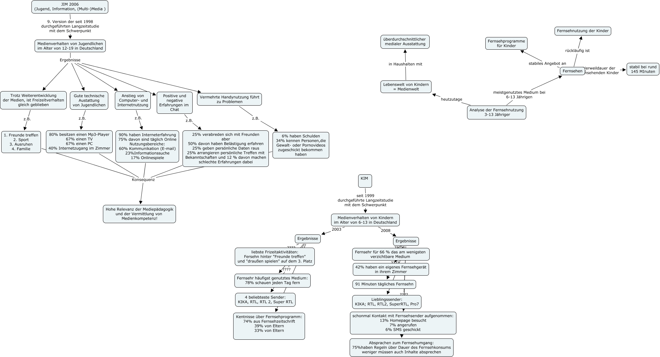 Dieses mit IHMC CmapTools erstellte CMap hat Informationen bezüglich: Aufgabe 2a, Ergebnisse ???? Fernsehr häufigst genutztes Medium: 78% schauen jeden Tag fern, KIM seit 1999 durchgeführte Langzeitstudie mit dem Schwerpunkt Medienverhalten von Kindern im Alter von 6-13 in Deutschland, 1. Freunde treffen 2. Sport 3. Ausruhen 4. Familie Konsequenz Hohe Relevanz der Mediepädagogik und der Vermittlung von Medienkompetenz!, Vermehrte Handynutzung führt zu Problemen z.B. 6% haben Schulden 34% kennen Personen,die Gewalt- oder Pornovideos zugeschickt bekommen haben, Medienverhalten von Jugendlichen im Alter von 12-19 in Deutschland Ergebnisse Gute technische Austattung von Jugendlichen, Trotz Weiterentwicklung der Medien, ist Freizeitverhalten gleich geblieben z.B. 1. Freunde treffen 2. Sport 3. Ausruhen 4. Familie, Medienverhalten von Jugendlichen im Alter von 12-19 in Deutschland Ergebnisse Trotz Weiterentwicklung der Medien, ist Freizeitverhalten gleich geblieben, JIM 2006 (Jugend, Information, (Multi-)Media ) 9. Version der seit 1998 durchgeführten Langzeitstudie mit dem Schwerpunkt Medienverhalten von Jugendlichen im Alter von 12-19 in Deutschland, Analyse der Fernsehnutzung 3-13 Jähriger heutzutage Lebenswelt von Kindern = Medienwelt, Fernsehen stabiles Angebot an Fernsehprogramme für Kinder, Ergebnisse ???? schonmal Kontakt mit Fernsehsender aufgenommen: 13% Homepage besucht 7% angerufen 6% SMS geschickt, Ergebnisse ???? 42% haben ein eigenes Fernsehgerät in ihrem Zimmer, Ergebnisse ???? Kentnisse über Fernsehprogramm: 74% aus Fernsehzeitschrift 39% von Eltern 33% von Eltern, Ergebnisse ???? liebste Frizeitaktivitäten: Fersehn hinter "Freunde treffen" und "draußen spielen" auf dem 3. Platz, Medienverhalten von Kindern im Alter von 6-13 in Deutschland 2008 Ergebnisse, Medienverhalten von Kindern im Alter von 6-13 in Deutschland 2003 Ergebnisse, 6% haben Schulden 34% kennen Personen,die Gewalt- oder Pornovideos zugeschickt bekommen haben Konsequenz Hohe Relevanz der Mediepädagogik und der Vermittlung von Medienkompetenz!, 80% besitzen einen Mp3-Player 67% einen TV 67% einen PC 40% Internetzugang im Zimmer Konsequenz Hohe Relevanz der Mediepädagogik und der Vermittlung von Medienkompetenz!, Medienverhalten von Jugendlichen im Alter von 12-19 in Deutschland Ergebnisse Vermehrte Handynutzung führt zu Problemen, Medienverhalten von Jugendlichen im Alter von 12-19 in Deutschland Ergebnisse Positive und negative Erfahrungen im Chat