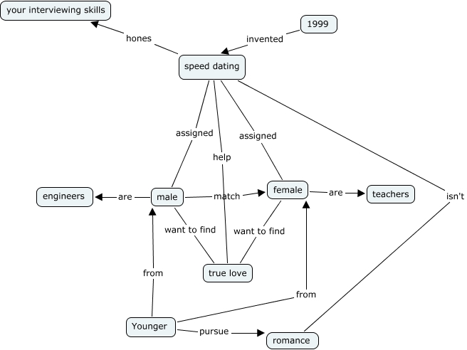 此概念图以 IHMC CmapTools 创建, 内含信息有关于: speed dating, speed dating hones your interviewing skills, male want to find true love, male are engineers, female are teachers, Younger pursue romance, Younger from male, 1999 invented speed dating, male match female, speed dating assigned male, speed dating assigned female, speed dating help true love, Younger from female, speed dating isn't romance, female want to find true love