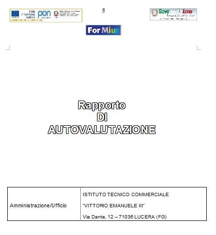 Frontespizio.jpg RAPPORTO DI AUTOVALUTAZIONE-ITC V.EMANUELE III -LUCERA.doc RAV 0.0.0 Frontespizio.pdf RAV 0.0.5 Presentazione del processo di autovalutazione svolto.pdf RAV 0.1.0 Presentazione della Amministrazione.pdf RAV 0.1.1Orientare l’stituzione attraverso lo sviluppo di una missione una visione e dei valori.pdf RAV 0.1.2 Sviluppare e implementare un sistema di gestione dell’istituzione delle sue performance e del cambiamento.pdf RAV 0.1.3 Motivare e supportare il personale dell'istituzione e agire come modello di ruol.pdf RAV 0.1.4 Gestire i rapporti con i politici e gli altri portatori di interesse al fine di assicurare la condivisione delle responsabilità.pdf RAV 0.2.1 Raccogliere informazioni relative ai bisogni presenti e futuri dei portatori di interesse.pdf RAV 0.2.2 Sviluppare rivedere e aggiornare politiche e strategie.pdf RAV 0.2.3 Implementare le strategie e le politiche nell’intera organizzazione.pdf RAV 0.2.4 Pianificare attuare e rivedere le attività per la modernizzazione e l’innovazione.pdf RAV 0.3.1 Pianificare gestire e potenziare le risorse umane in modo trasparente e coerente con le politiche e le strategie.pdf RAV 0.3.2 Identificare sviluppare ed utilizzare le competenze del personale allineando gli obiettivi individuali a quelli dell’istituzione.pdf RAV 0.3.3 Coinvolgere il personale attraverso lo sviluppo del dialogo e dell’empowerment.pdf RAV 0.4.1 Sviluppare e implementare relazioni con i partner chiave.pdf RAV 0.4.2 Sviluppare e implementare relazioni con i discenti le famiglie.pdf RAV 0.4.3 Gestire le risorse finanziarie.pdf RAV 0.4.4 Gestire le informazioni e la conoscenza.pdf RAV 0.4.5 Gestire la tecnologia.pdf RAV 0.4.6 Gestire le infrastrutture.pdf RAV 0.5.1 Identificare progettare gestire e migliorare i processi su base sistematica.pdf RAV 0.5.2 Sviluppare ed erogare servizi e prodotti orientati a discenti- famiglie-cittadini-clienti.pdf RAV 0.5.3 Innovare i processi coinvolgendo i cittadini-clienti.pdf RAV 0.6.1 I risultati della misurazione della soddisfazione dei discenti -delle famiglie.pdf RAV 0.6.2 Gli indicatori di orientamento ai discenti-alle famiglie.pdf RAV 0.7.1 I risultati della misurazione della soddisfazione del personale.pdf RAV 0.7.2 Gli indicatori di risultato del personal.pdf RAV 0.8.1 I risultati sociali percepiti dai portatori di interesse.pdf RAV 0.8.2 Gli indicatori della performance sociale dell’organizzazione.pdf RAV 0.9.1 I risultati esterni- output e outcome riferiti agli obiettivi.pdf RAV 0.9.2 I risultati interni.pdf RAV 1.0.0 RIEPILOGO PUNTEGGI.pdf