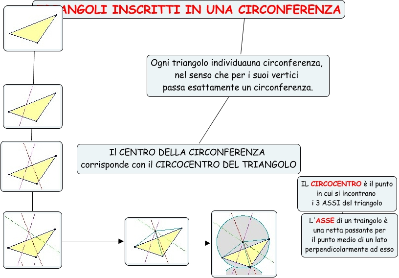 Questa Cmap, creata con IHMC CmapTools, contiene informazioni relative a: triangolo inscritto in una circonferenza, ????, IL CIRCOCENTRO è il punto in cui si incontrano i 3 ASSI del triangolo ???? L'ASSE di un traingolo è una retta passante per il punto medio di un lato perpendicolarmente ad esso, ????, ????, ????, ????, Ogni triangolo individuauna circonferenza, nel senso che per i suoi vertici passa esattamente un circonferenza. ???? Il CENTRO DELLA CIRCONFERENZA corrisponde con il CIRCOCENTRO DEL TRIANGOLO, TRIANGOLI INSCRITTI IN UNA CIRCONFERENZA ???? Ogni triangolo individuauna circonferenza, nel senso che per i suoi vertici passa esattamente un circonferenza.