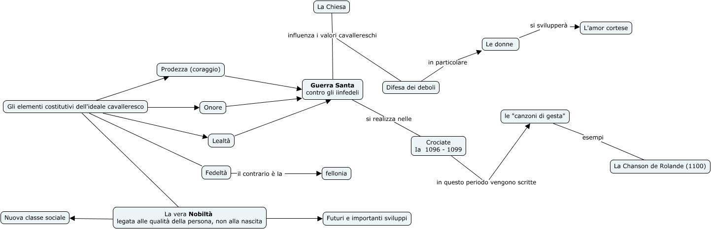 Questa Cmap, creata con IHMC CmapTools, contiene informazioni relative a: Gli elementi costitutivi dell'ideale cavalleresco, le "canzoni di gesta" esempi La Chanson de Rolande (1100), La vera Nobiltà legata alle qualità della persona, non alla nascita Futuri e importanti sviluppi, Crociate Ia 1096 - 1099 in questo periodo vengono scritte le "canzoni di gesta", Difesa dei deboli in particolare Le donne, Prodezza (coraggio) Guerra Santa contro gli iinfedeli, La Chiesa influenza i valori cavallereschi Difesa dei deboli, La vera Nobiltà legata alle qualità della persona, non alla nascita ???? Nuova classe sociale, Le donne si svilupperà L'amor cortese, Onore Guerra Santa contro gli iinfedeli, Gli elementi costitutivi dell'ideale cavalleresco Lealtà, Gli elementi costitutivi dell'ideale cavalleresco Onore, Lealtà Guerra Santa contro gli iinfedeli, Gli elementi costitutivi dell'ideale cavalleresco Prodezza (coraggio), Gli elementi costitutivi dell'ideale cavalleresco Fedeltà, Fedeltà il contrario è la fellonia, Gli elementi costitutivi dell'ideale cavalleresco La vera Nobiltà legata alle qualità della persona, non alla nascita, La Chiesa influenza i valori cavallereschi Guerra Santa contro gli iinfedeli, Guerra Santa contro gli iinfedeli si realizza nelle Crociate Ia 1096 - 1099