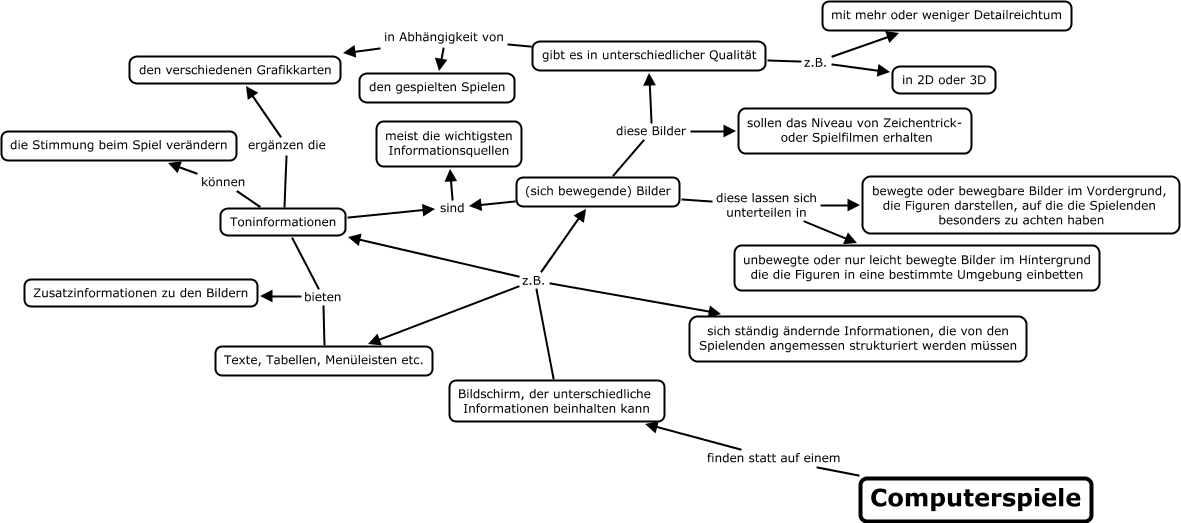 Dieses mit IHMC CmapTools erstellte CMap hat Informationen bezüglich: Aufgabe 3 Test Johanna, Toninformationen sind meist die wichtigsten Informationsquellen, (sich bewegende) Bilder sind meist die wichtigsten Informationsquellen, gibt es in unterschiedlicher Qualität z.B. mit mehr oder weniger Detailreichtum, (sich bewegende) Bilder diese lassen sich unterteilen in unbewegte oder nur leicht bewegte Bilder im Hintergrund die die Figuren in eine bestimmte Umgebung einbetten, Toninformationen bieten Zusatzinformationen zu den Bildern, Computerspiele finden statt auf einem Bildschirm, der unterschiedliche Informationen beinhalten kann, gibt es in unterschiedlicher Qualität in Abhängigkeit von den verschiedenen Grafikkarten, Bildschirm, der unterschiedliche Informationen beinhalten kann z.B. Texte, Tabellen, Menüleisten etc., Texte, Tabellen, Menüleisten etc. bieten Zusatzinformationen zu den Bildern, gibt es in unterschiedlicher Qualität in Abhängigkeit von den gespielten Spielen, (sich bewegende) Bilder diese Bilder sollen das Niveau von Zeichentrick- oder Spielfilmen erhalten, Toninformationen ergänzen die den verschiedenen Grafikkarten, Bildschirm, der unterschiedliche Informationen beinhalten kann z.B. Toninformationen, (sich bewegende) Bilder diese lassen sich unterteilen in bewegte oder bewegbare Bilder im Vordergrund, die Figuren darstellen, auf die die Spielenden besonders zu achten haben, (sich bewegende) Bilder diese Bilder gibt es in unterschiedlicher Qualität, Bildschirm, der unterschiedliche Informationen beinhalten kann z.B. (sich bewegende) Bilder, Toninformationen können die Stimmung beim Spiel verändern, gibt es in unterschiedlicher Qualität z.B. in 2D oder 3D, Bildschirm, der unterschiedliche Informationen beinhalten kann z.B. sich ständig ändernde Informationen, die von den Spielenden angemessen strukturiert werden müssen