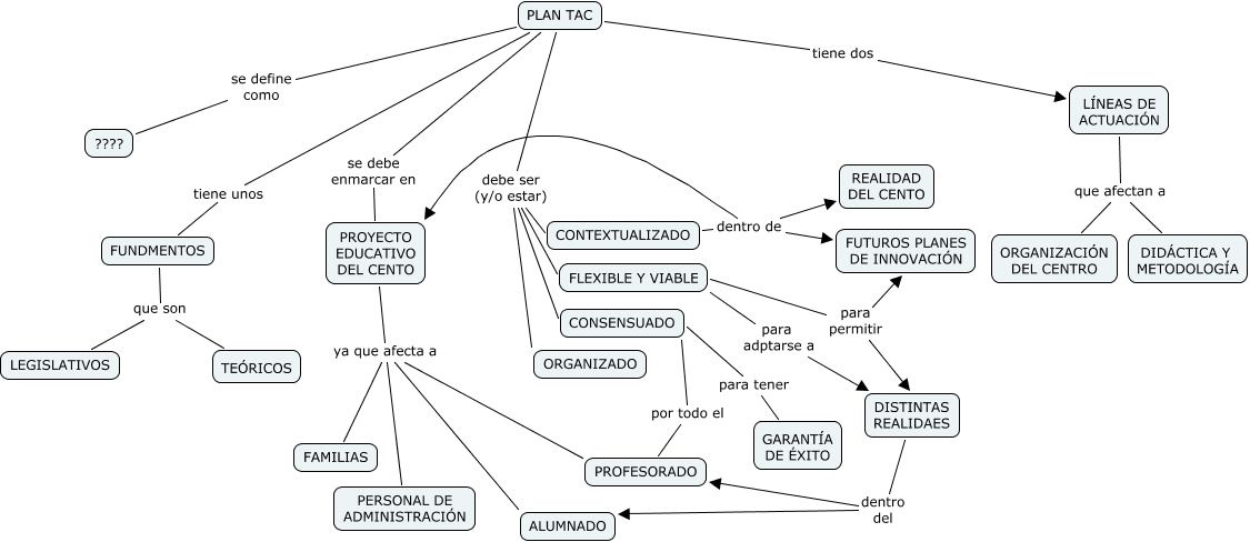 Este Cmap, tiene información relacionada con: PLAN TAC 00, DISTINTAS REALIDAES dentro del PROFESORADO, PLAN TAC tiene unos FUNDMENTOS, FUNDMENTOS que son LEGISLATIVOS, LÍNEAS DE ACTUACIÓN que afectan a DIDÁCTICA Y METODOLOGÍA, CONTEXTUALIZADO dentro de FUTUROS PLANES DE INNOVACIÓN, LÍNEAS DE ACTUACIÓN que afectan a ORGANIZACIÓN DEL CENTRO, PLAN TAC debe ser (y/o estar) ORGANIZADO, PLAN TAC debe ser (y/o estar) CONTEXTUALIZADO, FLEXIBLE Y VIABLE para permitir FUTUROS PLANES DE INNOVACIÓN, PROYECTO EDUCATIVO DEL CENTO ya que afecta a PROFESORADO, PROYECTO EDUCATIVO DEL CENTO ya que afecta a ALUMNADO, PLAN TAC debe ser (y/o estar) FLEXIBLE Y VIABLE, DISTINTAS REALIDAES dentro del ALUMNADO, PLAN TAC se debe enmarcar en PROYECTO EDUCATIVO DEL CENTO, FUNDMENTOS que son TEÓRICOS, FLEXIBLE Y VIABLE para adptarse a DISTINTAS REALIDAES, CONTEXTUALIZADO dentro de PROYECTO EDUCATIVO DEL CENTO, PLAN TAC tiene dos LÍNEAS DE ACTUACIÓN, PROYECTO EDUCATIVO DEL CENTO ya que afecta a FAMILIAS, CONTEXTUALIZADO dentro de REALIDAD DEL CENTO