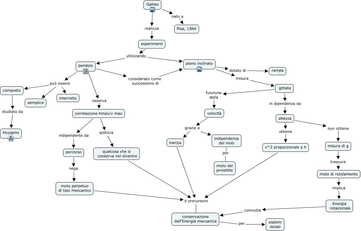 Questa Cmap, creata con IHMC CmapTools, contiene informazioni relative a: galileo, pendolo considerato come successione di piano inclinato, Galileo realizza esperimenti, moto perpetuo di tipo meccanico è precursore conservazione dell'Energia meccanica, Galileo nato a Pisa, 1564, qualcosa che si conserva nel divenire è precursore conservazione dell'Energia meccanica, altezza non ottiene misura di g, gittata funzione della velocità, pendolo osserva correlazione hmax/v max, v^2 proporzionale a h è precursore conservazione dell'Energia meccanica, esperimenti utilizzando piano inclinato, conservazione dell'Energia meccanica per sistemi isolati, correlazione hmax/v max ipotizza qualcosa che si conserva nel divenire, indipendenza dei moti per moto del proiettile, pendolo può essere composto, composto studiato da Huygens, esperimenti utilizzando pendolo, percorso nega moto perpetuo di tipo meccanico, gittata in dipendenza da altezza, altezza ottiene v^2 proporzionale a h, velocità grazie a indipendenza dei moti