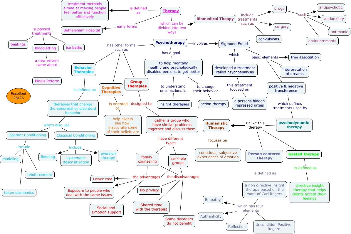 This Concept Map, created with IHMC CmapTools, has information related to: Ch14 Anesia Potter 25, family counseling the disadvantages Some disorders do not benefit, Operant Conditioning include modeling, Behavior Therapies is defined as therapies that change the abnormal or disorderd behavior, drugs such antideprresants, Psychotherapy has other forms such as Cognitive Therapies, therapies that change the abnormal or disorderd behavior which also use Classical Conditioning, bloodletting a new reform came about Pinels Reform, self-help groups the advantages Exposure to people who deal with the same issues, Betheleham Hospital supposed treatments bloodletting, Group Therapies designed to gather a group who have similar problems together and discuss them, psychodynamic therapy unlike this therapy Gestalt therapy, Operant Conditioning include reinforcement, psychodynamic therapy unlike this therapy Person centered Therapy, psychodynamic therapy unlike this therapy Humanistic Therapy, Sigmund Freud which developed a treatment called psychoanalysis, therapies that change the abnormal or disorderd behavior which also use Operant Conditioning, Operant Conditioning include token economics, a non directive insight therapy based on the work of Carl Rogers which has four elements Reflection, family counseling the disadvantages Shared time with the therapist, a non directive insight therapy based on the work of Carl Rogers which has four elements Empathy