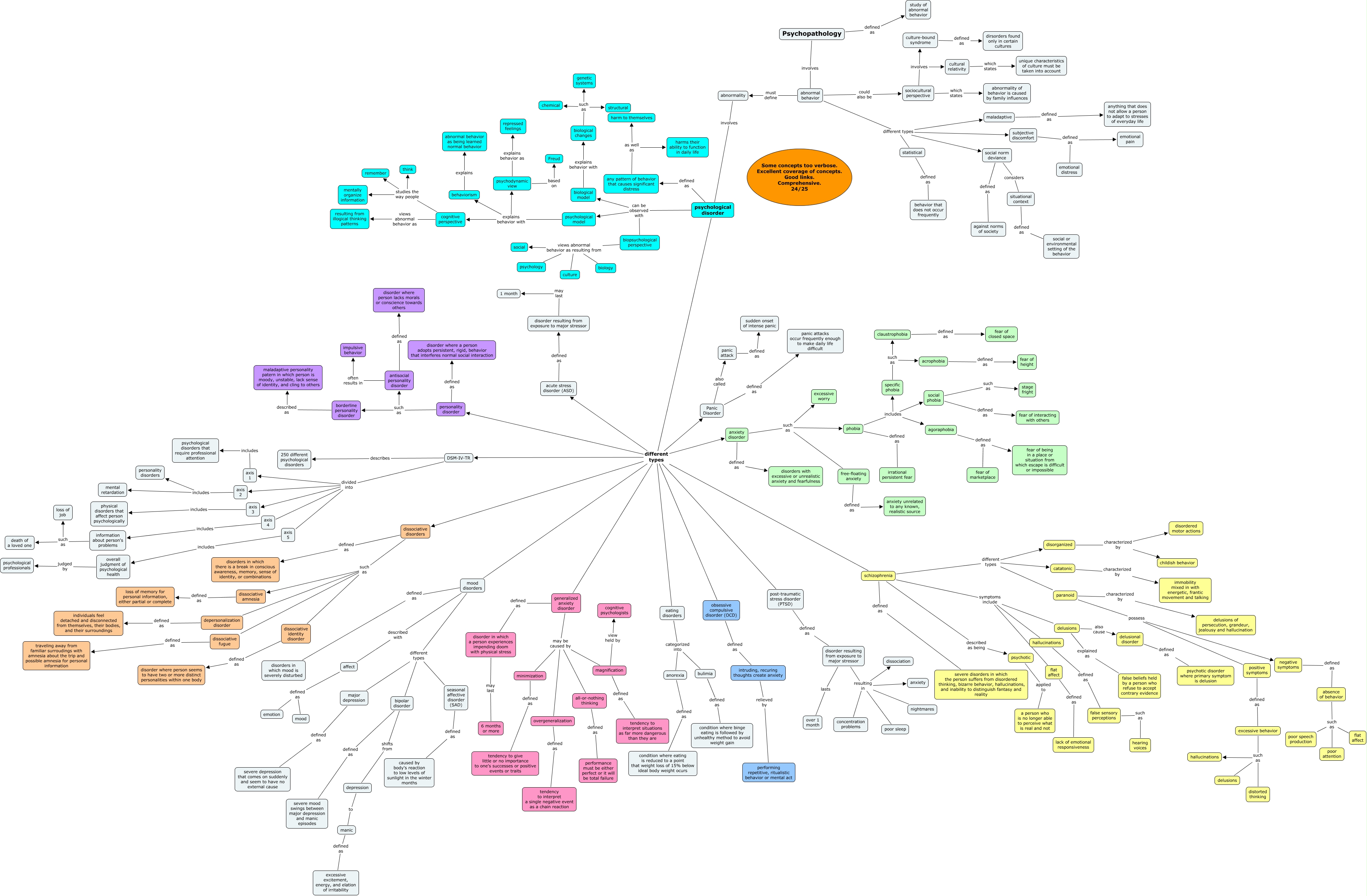 This Concept Map, created with IHMC CmapTools, has information related to: Ch14 Young Baek 24, dissociative disorders defined as disorders in which there is a break in conscious awareness, memory, sense of identity, or combinations, cognitive perspective studies the way people think, axis 3 includes physical disorders that affect person psychologically, disorder resulting from exposure to major stressor resulting in concentration problems, minimization defined as tendency to give little or no importance to one's successes or positive events or traits, psychological disorder different types personality disorder, acute stress disorder (ASD) defined as disorder resulting from exposure to major stressor, paranoid characterized by delusions of persecution, grandeur, jealousy and hallucination, psychological disorder different types mood disorders, overgeneralization defined as tendency to interpret a single negative event as a chain reaction, paranoid possess positive symptoms, acrophobia defined as fear of height, delusional disorder defined as psychotic disorder where primary symptom is delusion, biopsychological perspective views abnormal behavior as resulting from biology, psychological disorder can be observed with biopsychological perspective, psychotic applied to a person who is no longer able to perceive what is real and not, cognitive perspective studies the way people remember, psychological model explains behavior with psychodynamic view, manic defined as excessive excitement, energy, and elation of irritability, false sensory perceptions such as hearing voices