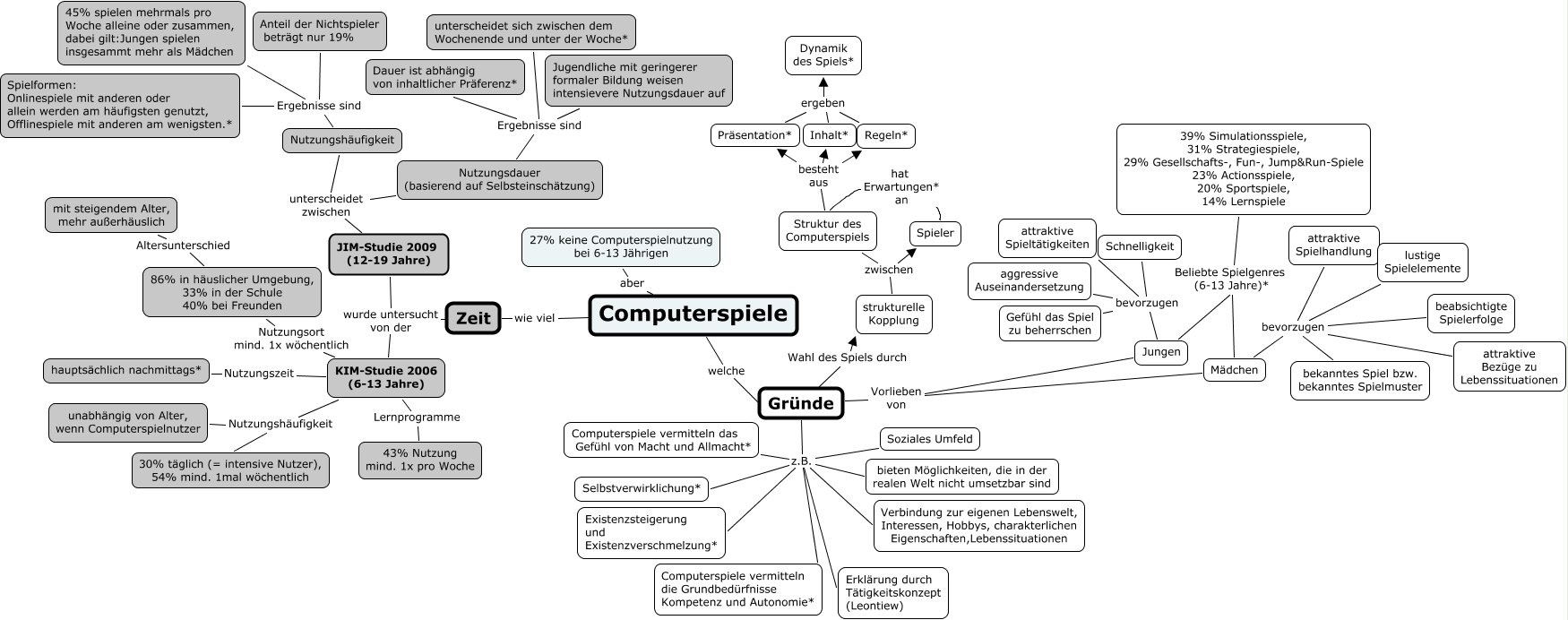 Dieses mit IHMC CmapTools erstellte CMap hat Informationen bezüglich: Computerspiele Aufgabe 3 Pia, Gründe z.B. bieten Möglichkeiten, die in der realen Welt nicht umsetzbar sind, Gründe Vorlieben von Mädchen, KIM-Studie 2006 (6-13 Jahre) Nutzungsort mind. 1x wöchentlich 86% in häuslicher Umgebung, 33% in der Schule 40% bei Freunden, Nutzungsdauer (basierend auf Selbsteinschätzung) Ergebnisse sind Jugendliche mit geringerer formaler Bildung weisen intensievere Nutzungsdauer auf, Gründe z.B. Erklärung durch Tätigkeitskonzept (Leontiew), Struktur des Computerspiels besteht aus Regeln*, Computerspiele aber 27% keine Computerspielnutzung bei 6-13 Jährigen, KIM-Studie 2006 (6-13 Jahre) Lernprogramme 43% Nutzung mind. 1x pro Woche, Zeit wurde untersucht von der JIM-Studie 2009 (12-19 Jahre), Mädchen Beliebte Spielgenres (6-13 Jahre)* 39% Simulationsspiele, 31% Strategiespiele, 29% Gesellschafts-, Fun-, Jump&Run-Spiele 23% Actionsspiele, 20% Sportspiele, 14% Lernspiele, Nutzungshäufigkeit Ergebnisse sind Anteil der Nichtspieler beträgt nur 19%, Spieler hat Erwartungen* an Struktur des Computerspiels, 86% in häuslicher Umgebung, 33% in der Schule 40% bei Freunden Altersunterschied mit steigendem Alter, mehr außerhäuslich, JIM-Studie 2009 (12-19 Jahre) unterscheidet zwischen Nutzungshäufigkeit, Mädchen bevorzugen lustige Spielelemente, Mädchen bevorzugen bekanntes Spiel bzw. bekanntes Spielmuster, Gründe Wahl des Spiels durch strukturelle Kopplung, Nutzungshäufigkeit Ergebnisse sind Spielformen: Onlinespiele mit anderen oder allein werden am häufigsten genutzt, Offlinespiele mit anderen am wenigsten.*, JIM-Studie 2009 (12-19 Jahre) unterscheidet zwischen Nutzungsdauer (basierend auf Selbsteinschätzung), Gründe z.B. Computerspiele vermitteln die Grundbedürfnisse Kompetenz und Autonomie*