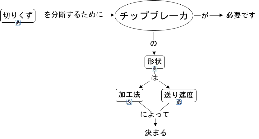 This Concept Map, created with IHMC CmapTools, has information related to: チップブレーカ, チップブレーカ の 形状, 加工法 によって 決まる, 切りくず を分断するために チップブレーカ, 形状 は 加工法, 送り速度 によって 決まる, 形状 は 送り速度, チップブレーカ が 必要です