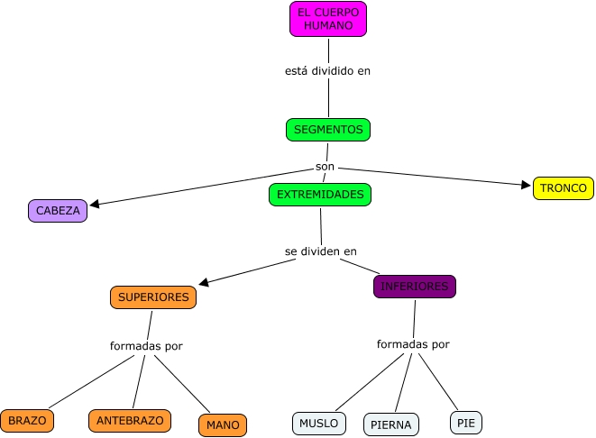 Este Cmap, tiene información relacionada con: SEGMENTOS DEL CUERPO HUMANO (Ana y Irene), INFERIORES formadas por MUSLO, EXTREMIDADES se dividen en SUPERIORES, SUPERIORES formadas por BRAZO, INFERIORES formadas por PIE, EXTREMIDADES se dividen en INFERIORES, SEGMENTOS son TRONCO, EL CUERPO HUMANO está dividido en SEGMENTOS, SUPERIORES formadas por MANO, INFERIORES formadas por PIERNA, SUPERIORES formadas por ANTEBRAZO, SEGMENTOS son EXTREMIDADES, SEGMENTOS son CABEZA
