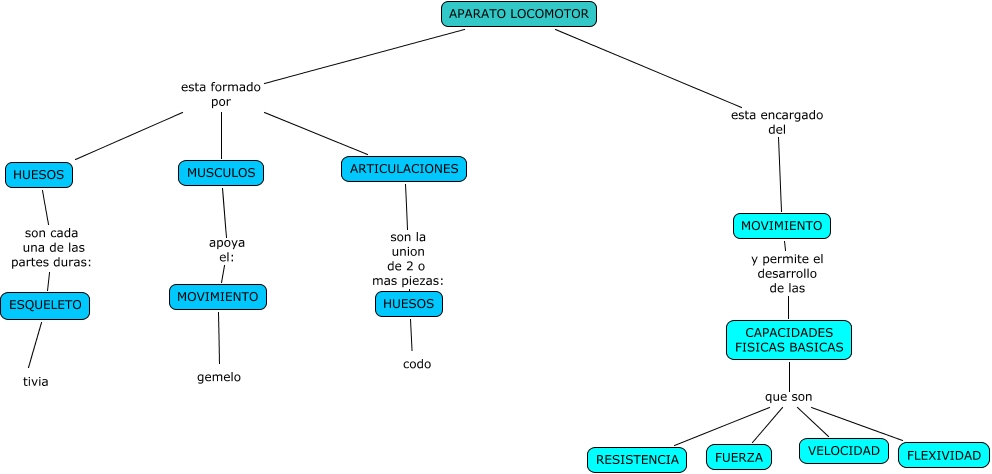 Este Cmap, tiene información relacionada con: APARATO LOCOMOTOR(Esther y Marta), HUESOS ???? codo, ESQUELETO T tivia, CAPACIDADES FISICAS BASICAS que son RESISTENCIA, CAPACIDADES FISICAS BASICAS que son VELOCIDAD, MOVIMIENTO ???? gemelo, APARATO LOCOMOTOR esta formado por ARTICULACIONES, MOVIMIENTO y permite el desarrollo de las CAPACIDADES FISICAS BASICAS, APARATO LOCOMOTOR esta formado por HUESOS, CAPACIDADES FISICAS BASICAS que son FLEXIVIDAD, ARTICULACIONES son la union de 2 o mas piezas: HUESOS, APARATO LOCOMOTOR esta formado por MUSCULOS, HUESOS son cada una de las partes duras: ESQUELETO, CAPACIDADES FISICAS BASICAS que son FUERZA, APARATO LOCOMOTOR esta encargado del MOVIMIENTO, MUSCULOS apoya el: MOVIMIENTO