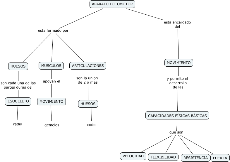 Este Cmap, tiene información relacionada con: APARATO LOCOMOTOR(Eduardo y Francisco), HUESOS ???? codo, CAPACIDADES FÍSICAS BÁSICAS que son RESISTENCIA, APARATO LOCOMOTOR esta encargado del MOVIMIENTO, ESQUELETO radio, MOVIMIENTO y permite el desarrollo de las CAPACIDADES FÍSICAS BÁSICAS, APARATO LOCOMOTOR esta formado por HUESOS, CAPACIDADES FÍSICAS BÁSICAS que son FUERZA, CAPACIDADES FÍSICAS BÁSICAS que son FLEXIBILIDAD, APARATO LOCOMOTOR esta formado por ARTICULACIONES, MUSCULOS apoyan el MOVIMIENTO, ARTICULACIONES son la union de 2 o más HUESOS, HUESOS son cada una de las partes duras del ESQUELETO, MOVIMIENTO ???? gemelos, CAPACIDADES FÍSICAS BÁSICAS que son VELOCIDAD, APARATO LOCOMOTOR esta formado por MUSCULOS