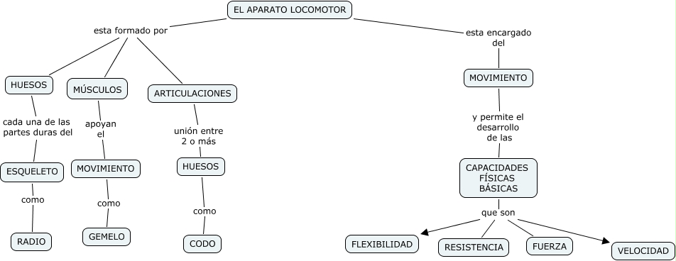 Este Cmap, tiene información relacionada con: APARATO LOCOMOTOR(Sara yAle), EL APARATO LOCOMOTOR esta formado por ARTICULACIONES, MOVIMIENTO como GEMELO, CAPACIDADES FÍSICAS BÁSICAS que son FLEXIBILIDAD, EL APARATO LOCOMOTOR esta encargado del MOVIMIENTO, CAPACIDADES FÍSICAS BÁSICAS que son RESISTENCIA, MÚSCULOS apoyan el MOVIMIENTO, CAPACIDADES FÍSICAS BÁSICAS que son FUERZA, MOVIMIENTO y permite el desarrollo de las CAPACIDADES FÍSICAS BÁSICAS, EL APARATO LOCOMOTOR esta formado por HUESOS, ESQUELETO como RADIO, EL APARATO LOCOMOTOR esta formado por MÚSCULOS, HUESOS como CODO, CAPACIDADES FÍSICAS BÁSICAS que son VELOCIDAD, HUESOS cada una de las partes duras del ESQUELETO, ARTICULACIONES unión entre 2 o más HUESOS