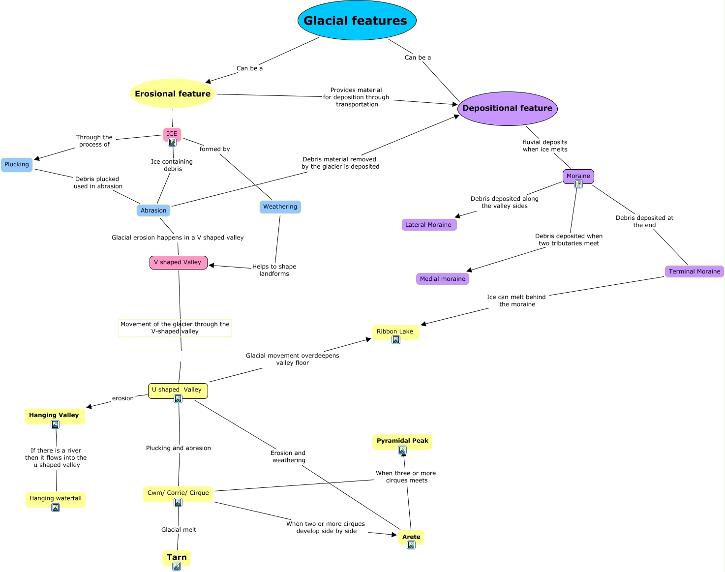 This Concept Map, created with IHMC CmapTools, has information related to: EVANS L GLACIAL FEATURES 22.1.13.cmap, U shaped Valley Erosion and weathering Arete, Hanging Valley If there is a river then it flows into the u shaped valley Hanging waterfall, Weathering Helps to shape landforms V shaped Valley, Cwm/ Corrie/ Cirque When two or more cirques develop side by side Arete, Erosional feature Provides material for deposition through transportation Depositional feature, Terminal Moraine Ice can melt behind the moraine Ribbon Lake, ICE formed by Weathering, U shaped Valley erosion Hanging Valley, Moraine Debris deposited along the valley sides Lateral Moraine, U shaped Valley Plucking and abrasion Cwm/ Corrie/ Cirque, Depositional feature fluvial deposits when ice melts Moraine, Cwm/ Corrie/ Cirque Glacial melt Tarn, Moraine Debris deposited when two tributaries meet Medial moraine, Abrasion Glacial erosion happens in a V shaped valley V shaped Valley, V shaped Valley U shaped Valley, Plucking Debris plucked used in abrasion Abrasion, Abrasion Debris material removed by the glacier is deposited Depositional feature, Erosional feature ICE, Glacial features Can be a Depositional feature, Arete When three or more cirques meets Pyramidal Peak
