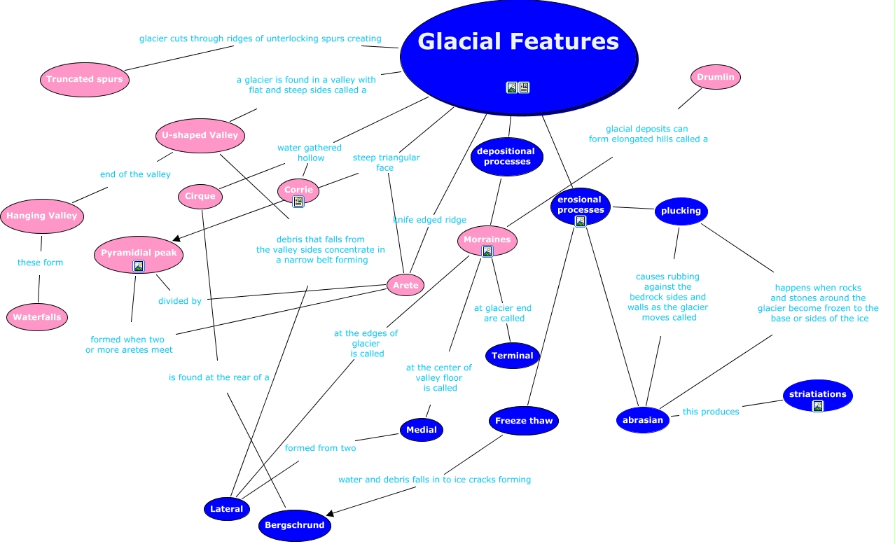 This Concept Map, created with IHMC CmapTools, has information related to: JOHN N Glacial Features Cmap.cmap, Corrie water gathered hollow Cirque, Glacial Features erosional processes Freeze thaw, Pyramidial peak formed when two or more aretes meet Arete, Medial formed from two Lateral, plucking causes rubbing against the bedrock sides and walls as the glacier moves called abrasian, Freeze thaw water and debris falls in to ice cracks forming Bergschrund, Morraines at the edges of glacier is called Lateral, U-shaped Valley debris that falls from the valley sides concentrate in a narrow belt forming Lateral, Bergschrund is found at the rear of a Cirque, Glacial Features a glacier is found in a valley with flat and steep sides called a U-shaped Valley, Glacial Features erosional processes abrasian, Glacial Features steep triangular face Pyramidial peak, Glacial Features knife edged ridge Arete, Morraines at glacier end are called Terminal, Glacial Features water gathered hollow Cirque, Glacial Features glacier cuts through ridges of unterlocking spurs creating Truncated spurs, U-shaped Valley end of the valley Hanging Valley, Hanging Valley these form Waterfalls, abrasian this produces striatiations, Pyramidial peak divided by Arete