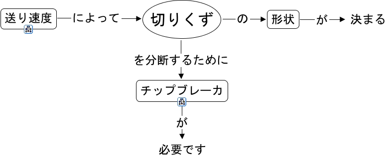 このコンセプトマップに関連する情報: 切りくず, 切りくず の 形状, チップブレーカ が 必要です, 送り速度 によって 切りくず, 形状 が 決まる, 切りくず を分断するために チップブレーカ