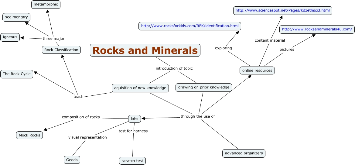 This Concept Map, created with IHMC CmapTools, has information related to: Rocks and Minerals, aquisition of new knowledge through the use of labs, Rock Classification three major sedimentary, aquisition of new knowledge through the use of online resources, labs test for harness scratch test, online resources content material http://www.sciencespot.net/Pages/kdzethsci3.html, drawing on prior knowledge through the use of online resources, drawing on prior knowledge through the use of advanced organizers, Rock Classification three major igneous, drawing on prior knowledge through the use of labs, labs composition of rocks Mock Rocks, online resources exploring http://www.rocksforkids.com/RFK/identification.html, online resources pictures http://www.rocksandminerals4u.com/, aquisition of new knowledge through the use of advanced organizers, labs visual representation Geods, aquisition of new knowledge teach Rock Classification, Rock Classification three major metamorphic, Rocks and Minerals introduction of topic drawing on prior knowledge, Rocks and Minerals introduction of topic aquisition of new knowledge, aquisition of new knowledge teach The Rock Cycle