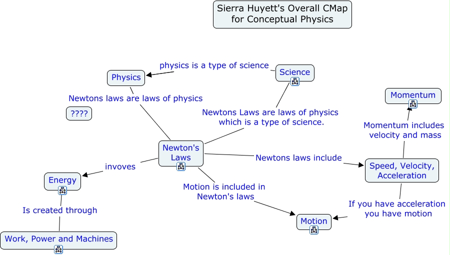 This Concept Map, created with IHMC CmapTools, has information related to: Huyett_Sierra_All-Unit Cmap, Newton's Laws Motion is included in Newton's laws Motion, Newton's Laws Newtons laws include Speed, Velocity, Acceleration, Physics Newtons laws are laws of physics Newton's Laws, Newton's Laws invoves Energy, Speed, Velocity, Acceleration If you have acceleration you have motion Motion, Science Newtons Laws are laws of physics which is a type of science. Newton's Laws, Science physics is a type of science Physics, Speed, Velocity, Acceleration Momentum includes velocity and mass Momentum, Science physics is a type of science Physics, Energy Is created through Work, Power and Machines