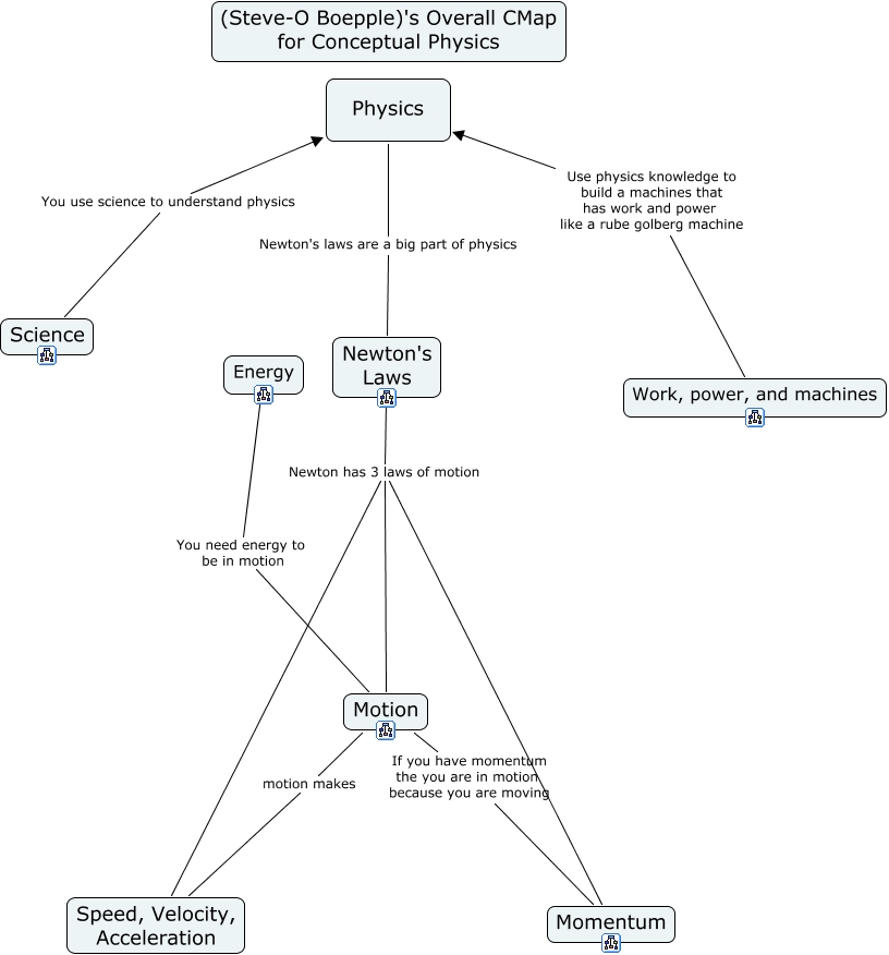 This Concept Map, created with IHMC CmapTools, has information related to: Boepple_Steve All-Unit CMap Template, Science You use science to understand physics Physics, Motion motion makes Speed, Velocity, Acceleration, Motion If you have momentum the you are in motion because you are moving Momentum, Physics Newton's laws are a big part of physics Newton's Laws, Newton's Laws Newton has 3 laws of motion Motion, Newton's Laws Newton has 3 laws of motion Momentum, Newton's Laws Newton has 3 laws of motion Speed, Velocity, Acceleration, Work, power, and machines Use physics knowledge to build a machines that has work and power like a rube golberg machine Physics, Energy You need energy to be in motion Motion