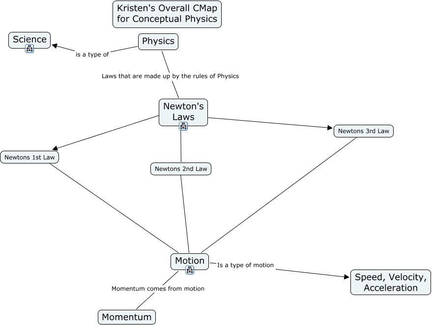 This Concept Map, created with IHMC CmapTools, has information related to: Huffman_Kristen All-Unit CMap, Newton's Laws ???? Newtons 3rd Law, Motion Momentum comes from motion Momentum, Physics Laws that are made up by the rules of Physics Newton's Laws, Newtons 1st Law ???? Motion, Newtons 3rd Law ???? Motion, Newtons 2nd Law ???? Motion, Newton's Laws ???? Newtons 2nd Law, Newton's Laws ???? Newtons 1st Law, Motion Is a type of motion Speed, Velocity, Acceleration, Physics is a type of Science