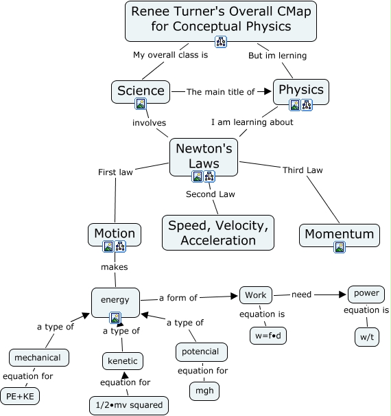 This Concept Map, created with IHMC CmapTools, has information related to: Turner_Renee All-Unit Cmap, mechanical a type of energy, mgh equation for potencial, 1/2•mv squared equation for kenetic, Motion makes energy, Renee Turner's Overall CMap for Conceptual Physics My overall class is Science, Science involves Newton's Laws, power equation is w/t, Newton's Laws Second Law Speed, Velocity, Acceleration, kenetic a type of energy, PE+KE equation for mechanical, Science The main title of Physics, Newton's Laws Third Law Momentum, energy a form of Work, Renee Turner's Overall CMap for Conceptual Physics But im lerning Physics, Work equation is w=f•d, Newton's Laws First law Motion, Work need power, Physics I am learning about Newton's Laws, potencial a type of energy