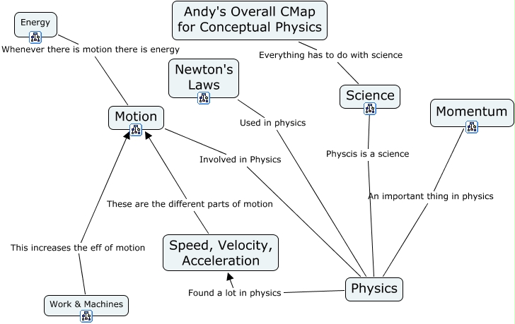 This Concept Map, created with IHMC CmapTools, has information related to: Belisario_Vinny All-Unit Cmap, Physics Found a lot in physics Speed, Velocity, Acceleration, Work & Machines This increases the eff of motion Motion, Energy Whenever there is motion there is energy Motion, Momentum An important thing in physics Physics, Motion Involved in Physics Physics, Speed, Velocity, Acceleration These are the different parts of motion Motion, Newton's Laws Used in physics Physics, Science Physcis is a science Physics, Andy's Overall CMap for Conceptual Physics Everything has to do with science Science