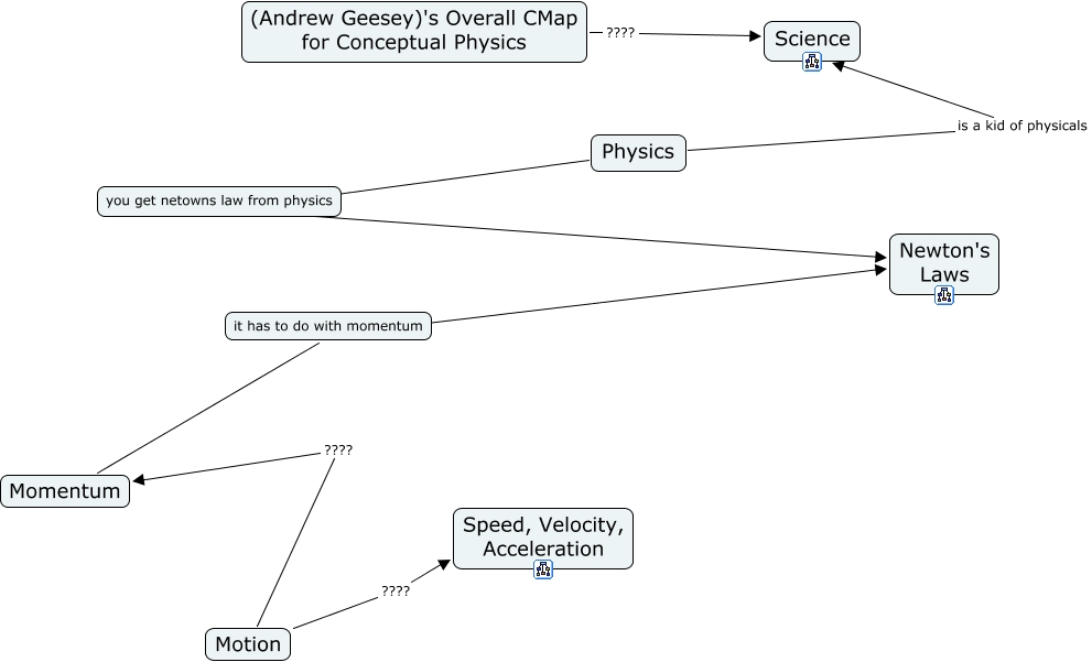 This Concept Map, created with IHMC CmapTools, has information related to: Geesey_Andrew_All_Unit_CMap_Template, Motion ???? Speed, Velocity, Acceleration, Motion ???? Momentum, Physics is a kid of physicals Science, (Andrew Geesey)'s Overall CMap for Conceptual Physics ???? Science, Physics ???? Newton's Laws, Momentum ???? Newton's Laws