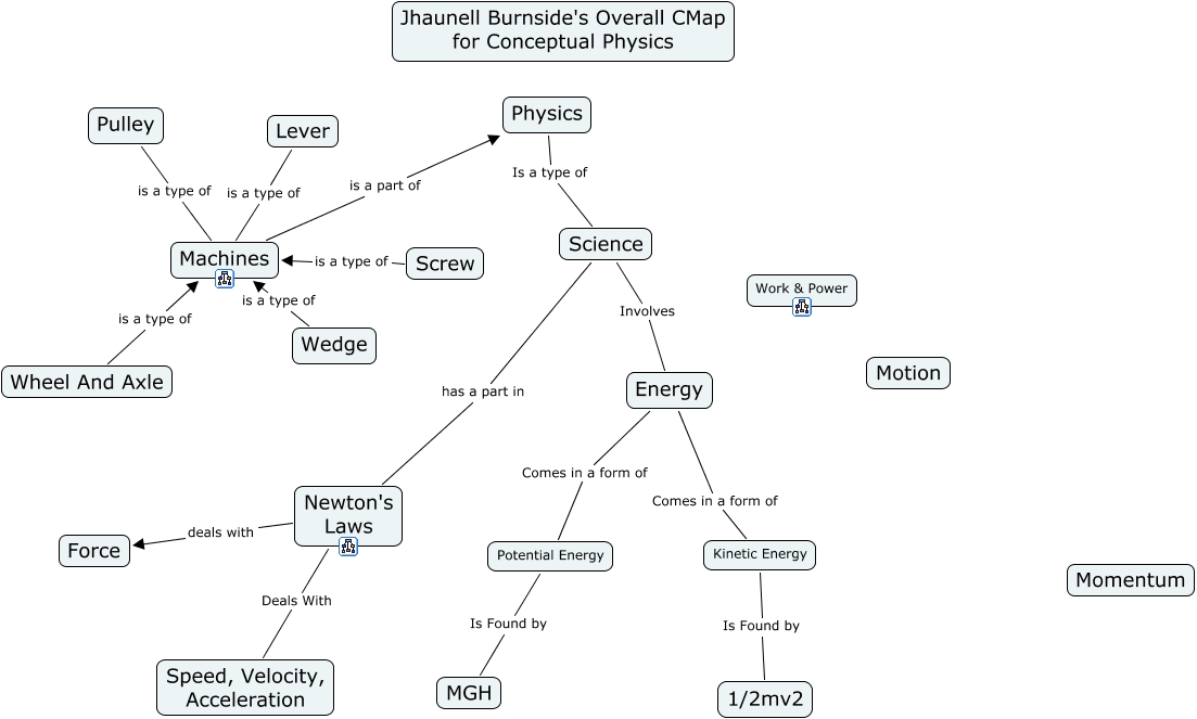 This Concept Map, created with IHMC CmapTools, has information related to: Burnside_Jhaunell All-unit Cmap, Kinetic Energy Is Found by 1/2mv2, Wheel And Axle is a type of Machines, Newton's Laws deals with Force, Potential Energy Is Found by MGH, Energy Comes in a form of Potential Energy, Pulley is a type of Machines, Screw is a type of Machines, Machines is a part of Physics, Science has a part in Newton's Laws, Newton's Laws Deals With Speed, Velocity, Acceleration, Science Involves Energy, Wedge is a type of Machines, Lever is a type of Machines, Physics Is a type of Science, Energy Comes in a form of Kinetic Energy