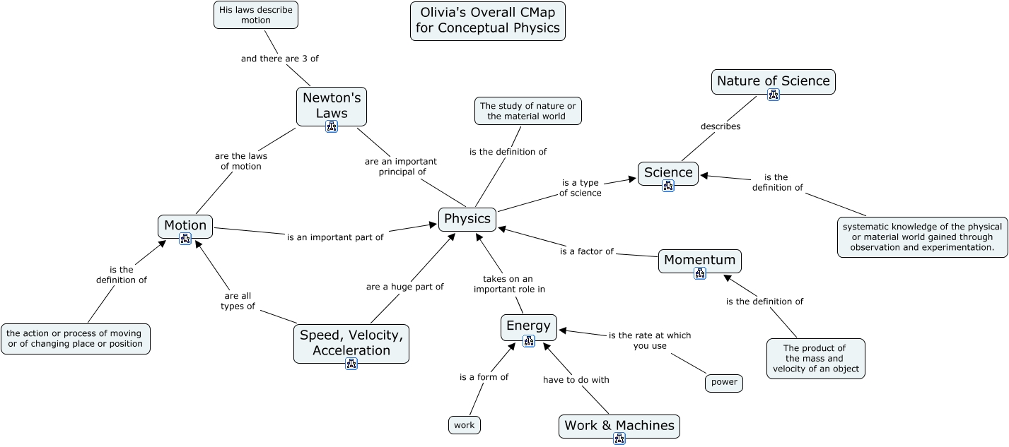 This Concept Map, created with IHMC CmapTools, has information related to: Weaver_Olivia All-Unit Cmap, Work & Machines have to do with Energy, His laws describe motion and there are 3 of Newton's Laws, the action or process of moving or of changing place or position is the definition of Motion, work is a form of Energy, Motion is an important part of Physics, The product of the mass and velocity of an object is the definition of Momentum, Newton's Laws are an important principal of Physics, Speed, Velocity, Acceleration are a huge part of Physics, Momentum is a factor of Physics, The study of nature or the material world is the definition of Physics, systematic knowledge of the physical or material world gained through observation and experimentation. is the definition of Science, Newton's Laws are the laws of motion Motion, Speed, Velocity, Acceleration are all types of Motion, Nature of Science describes Science, Energy takes on an important role in Physics, power is the rate at which you use Energy, Physics is a type of science Science