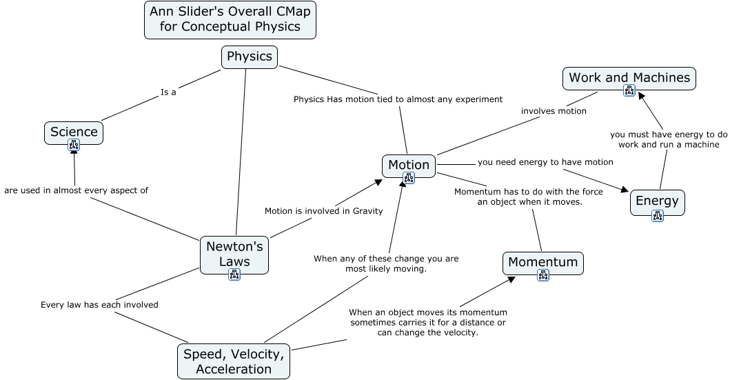 This Concept Map, created with IHMC CmapTools, has information related to: Slider_Ann_All-Unit CMap, Work and Machines involves motion Motion, Newton's Laws Motion is involved in Gravity Motion, Physics Physics Has motion tied to almost any experiment Motion, Speed, Velocity, Acceleration When any of these change you are most likely moving. Motion, Motion you need energy to have motion Energy, Physics ???? Newton's Laws, Speed, Velocity, Acceleration When an object moves its momentum sometimes carries it for a distance or can change the velocity. Momentum, Newton's Laws are used in almost every aspect of Science, Energy you must have energy to do work and run a machine Work and Machines, Physics Is a Science, Newton's Laws Every law has each involved Speed, Velocity, Acceleration, Motion Momentum has to do with the force an object when it moves. Momentum