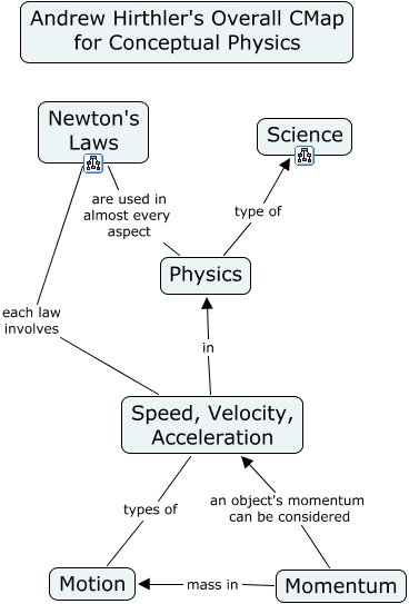This Concept Map, created with IHMC CmapTools, has information related to: Hirthler_Andrew All-unit Cmap, Speed, Velocity, Acceleration types of Motion, Momentum mass in Motion, Newton's Laws each law involves Speed, Velocity, Acceleration, Physics type of Science, Speed, Velocity, Acceleration in Physics, Momentum an object's momentum can be considered Speed, Velocity, Acceleration, Newton's Laws are used in almost every aspect Physics